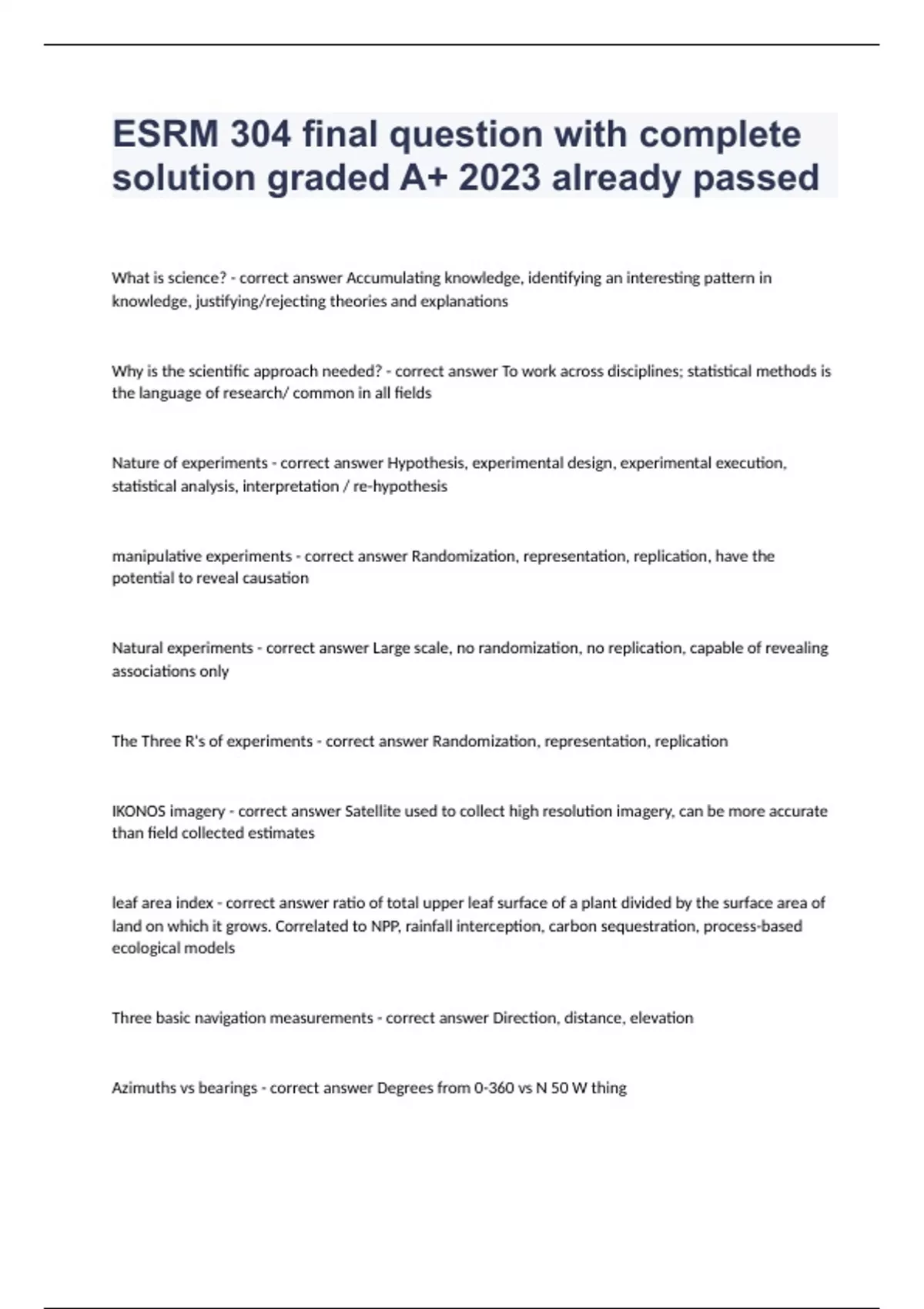 ESRM 304 final question with complete solution graded A+ 2023 already passed What is science? - correct answer Accumulating knowledge, identifying an interesting pattern in knowledge, justifying/rejecting theories and explanations Why is the scientific approach needed? - correct answer To work across disciplines; statistical methods is the language of research/ common in all fields Nature of experiments - correct answer Hypothesis, experimental design, experimental execution, statistical analysis, interpretation / re-hypothesis manipulative experiments - correct answer Randomization, representation, replication, have the potential to reveal causation Natural experiments - correct answer Large scale, no randomization, no replication, capable of revealing associations only The Three R's of experiments - correct answer Randomization, representation, replication IKONOS imagery - correct answer Satellite used to collect high resolution imagery, can be more accurate than field collected estimates leaf area index - correct answer ratio of total upper leaf surface of a plant divided by the surface area of land on which it grows. Correlated to NPP, rainfall interception, carbon sequestration, process-based ecological models Three basic navigation measurements - correct answer Direction, distance, elevation Azimuths vs bearings - correct answer Degrees from 0-360 vs N 50 W thing