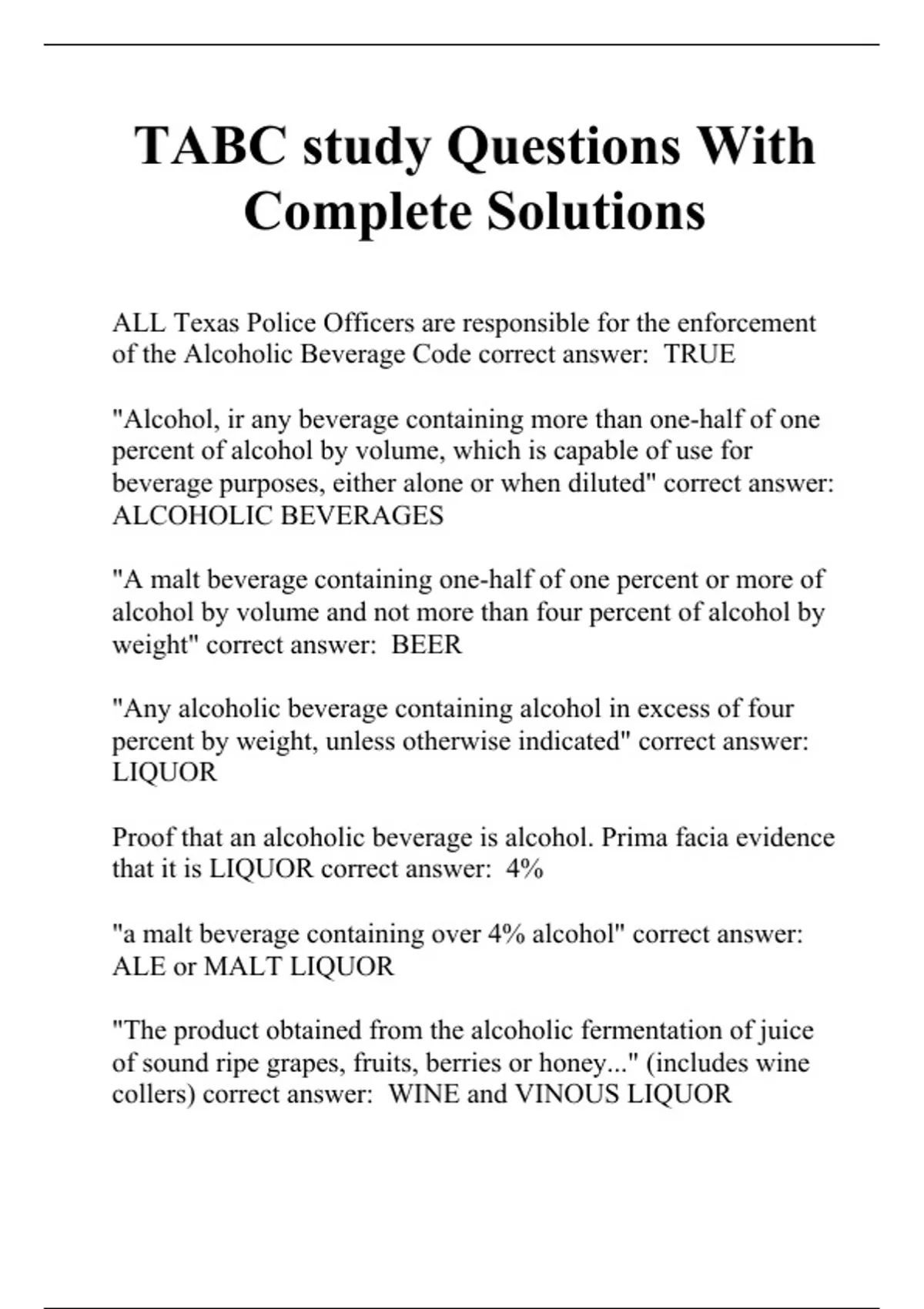 ALL Texas Police Officers are responsible for the enforcement of the Alcoholic Beverage Code correct answer: TRUE "Alcohol, ir any beverage containing more than one-half of one percent of alcohol by volume, which is capable of use for beverage purposes, either alone or when diluted" correct answer: ALCOHOLIC BEVERAGES "A malt beverage containing one-half of one percent or more of alcohol by volume and not more than four percent of alcohol by weight" correct answer: BEER "Any alcoholic beverage containing alcohol in excess of four percent by weight, unless otherwise indicated" correct answer: LIQUOR Proof that an alcoholic beverage is alcohol. Prima facia evidence that it is LIQUOR correct answer: 4% "a malt beverage containing over 4% alcohol" correct answer: ALE or MALT LIQUOR "The product obtained from the alcoholic fermentation of juice of sound ripe grapes, fruits, berries or honey..." (includes wine collers) correct answer: WINE and VINOUS LIQUOR