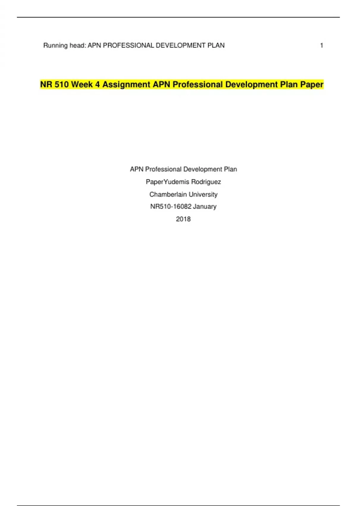 NR 510 Week 4 Assignment APN Professional Development Plan Paper. Running head: APN PROFESSIONAL DEVELOPMENT PLAN 1 NR 510 Week 4 Assignment APN Professional Development Plan Paper APN Professional Development Plan Paper Yudemis Rodriguez Chamberlain University NR January 2018Introduction to the APN professional development plan Regardless of ones’ career path, a professional development plan is imperative for an individual to set goals, develop a plan and schedule a timeline to achieve them (Perry, 2017). The famous saying by Winston Churchill “if you fail to plan, then you plan to fail” (Treiger, 2016) can be directly applied to someone’s career. A professional development plan can provide a visual outline and help to identify current and future needs, resources needed, and to help ensure goals are always met. Relative to the authors current nursing care and the development of the nursing process, goals are established, and later, “care” or in this case, goal achievement is evaluated. According to Perry (2017), in order for goals to be valuable they should be designed with the acronym SMART in mind. The letter S stands for specific goals, one that is clear- what does it look like and how will the author get there? For example, the author is a graduate student whose goal is to complete a master’s in nursing degree and obtain an Advanced Practice Nurse license after sitting for board exams. It is important to write down these goals and why they are important, so it is not forgotten or pushed aside as life can become overwhelming. The letter M stands for a goal that is measurable. This is evident in the authors goal statement. The letter A in the acronym stands for attainable goals. The Master’s program has provided the author with a challenge, nonetheless, while at the same time providing the appropriate knowledge, skills, and abilities needed to achieve the goal. The letter R represents realistic or a relevant goal. This goal is both high and realistic. Time represents the letter T. Time provides a sense of urgency. Working as a full-time employee, and taking care of personal matters at home, the author sets a measurable goal of two years’ time as the anticipated graduate year is 2019. The professional development plan can be modified according to ones’ current situation as life happens and things can change.