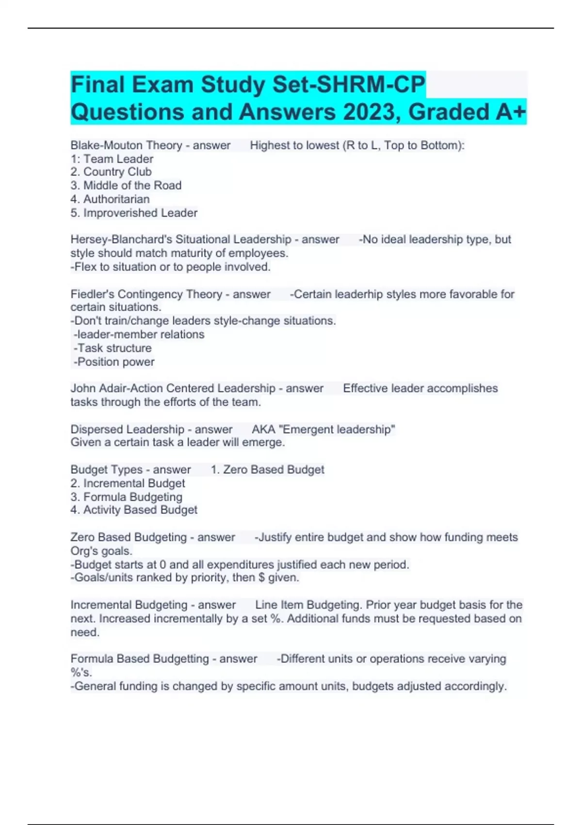 Final Exam Study Set-SHRM-CP Questions and Answers 2023, Graded A+ Blake-Mouton Theory Highest to lowest (R to L, Top to Bottom): 1: Team Leader 2. Country Club 3. Middle of the Road 4. Authoritarian 5. Improverished Leader Hersey-Blanchard's Situational Leadership -No ideal leadership type, but style should match maturity of employees. -Flex to situation or to people involved. Fiedler's Contingency Theory -Certain leaderhip styles more favorable for certain situations. -Don't train/change leaders style-change situations. -leader-member relations -Task structure -Position power John Adair-Action Centered Leadership Effective leader accomplishes tasks through the efforts of the team. Dispersed Leadership AKA "Emergent leadership" Given a certain task a leader will emerge. Budget Types 1. Zero Based Budget 2. Incremental Budget 3. Formula Budgeting 4. Activity Based Budget Zero Based Budgeting -Justify entire budget and show how funding meets Org's goals. -Budget starts at 0 and all expenditures justified each new period. -Goals/units ranked by priority, then $ given. Incremental Budgeting Line Item Budgeting. Prior year budget basis for the next. Increased incrementally by a set %. Additional funds must be requested based on need. Formula Based Budgetting -Different units or operations receive varying %'s. -General funding is changed by specific amount units, budgets adjusted accordingly. Activity Based Budgetting -Not how much to divide $, but how much it costs to perform enterprise activities. -Funding may be allocated in strategic significance. Balanced Scorecard Measurement approach that provides an overall picture of an organization's performance in the following ways: Metrics from 4 organizational perspectives 1) Financial 2) Customer 3) Internal Business processes 4) Learning + Growth HR Strategic Process 1) Get the big picture 2) Conduct HR SWOT analysis 3) Develop HR Mission & Vision Statements 4) Conduct detailed HR analysis 5) Determine critical people issues. 6) Develop HR goals, metrics, consequences, & solutions. 7) Develop an implementation & evaluation plan. ADDIE Model A-Assess D-Design D-Develop I-Implement E-Evaluate (A)DDIE Assess-Difference between present and desired and what is contributing to the gap? A(D)DIE Design-Intervention-targets, audiences, objectives, and how will be measured. AD(D)IE Develop-The solution, who should be involved and how it will be delivered. ADD(I)E Implement- ADDI(E) Evaluate- TQM Top Quality Management W. Edwards Deming -Poor products essentially the fault of top managers and no one else. -Popular in Japan. -Deming award -Scored on 14 point system Joseph M. Juran -"Fitness to use" Reliability of product or service. -Trilogy-quality planning, quality control, quality ipmrovement Phillip B. Crosby -14 point program (Similar to Deming) -4 Absolutes: -Definition of quality -Prevention system -Peformance Standard (Zero Defects) -Measurement of quality (Cost of non-conformance) Systems Theory Inputs-Process-Outputs TOC Theory of Constraints-Elijah Goldratts book-The Goal Six Sigma Eliminates defects -not more than 3.4 defects per million opportunities DMAIC For EXISTING processes. Define, Measure, Analyze, Improve, Control DMADV For NEW processes. Define, Measure, Analyze, Design, Verify Workforce Analysis 1) Supply Analysis 2) Demand Analysis 3) Gap Analysis 4) Solution Analysis Supply Analysis The skill mix in an organization Future needs based on attrition and org. growth. Where are we now? What do we have? Demand Analysis Where do we want to be? What do we need? Gap Analysis What's lacking? What will we need in the future? (KSA's) Solution Analysis What can we afford? How will we get what we need? Delphi Technique Progressively collects info from a group on a preselected issue. Idea-survey, refine-repeat. Don't have to actually meet. Nominal Group Technique Accesses a variety of individuals to forecast ideas + assumptions, then prioritize issues -Face to face -Led by moderator. -Write down, round robin ideas. Replacement planning Short Term, Snapshot Succession planning Longer team, keeping talent in the pipeline Radicalism Believe that management-labor conflict is inherent in capitalism and resolved only change in the economic system. Pluralist Multiple forces at work in labor relationships, each with their own agenda. Unitarist Employers and employees can work together for common good. ILO 8 core standards UN Global Impact 10 Standards OECD Org for Economic Cooperation and Development. Addresses globalization. WTO World Trade Organization 4 Core standards Diaspora Global remittance Money sent "home" from migrants working in other countries. $414 billion in 2013. Demographic Dichotomy Workforce in emerging countries becoming disproportionately young, but in developing countries, aging rapidly. "Push" factors 1) Need for new markets 2) Increased cost pressures and competition. 3) Short falls in natural resources and talent supply. 4) Government policies 5) Trade agreements 6) Globalized supply chain. "Pull" Factors 1) Greater strategic control 2) Government policies that promote outward foreign investments. 3) Trade agreements. Greenfield Operation New operation from the ground up. Brownfield Operation Repurposing old operation Upstream Strategies Decisions made at HQ-workforce alignment, organizational development, knowledge and experience sharing. Downstream Strategies Decisions make at local level. GI - LR Matrix Global Integration - Local Responsiveness Driven by four factors: -Market Drivers -Cost Drivers -Governmental Drivers -Competitive Drivers Vertical Axis is Integration Horizontal Axis is LR Top L: Global-Strong links btwn HQ and subsidiaries. Top R: Transnational-Strong links between HQ and subsidiaries and amoung subsidiaries. Bottom L: International-Weak links between HQ and dependent subsidiaries. Bottom R: Multidomestic-Weak links between HQ and autonomous subsidiaries. Extent to which underlying operations such as IT, Fina