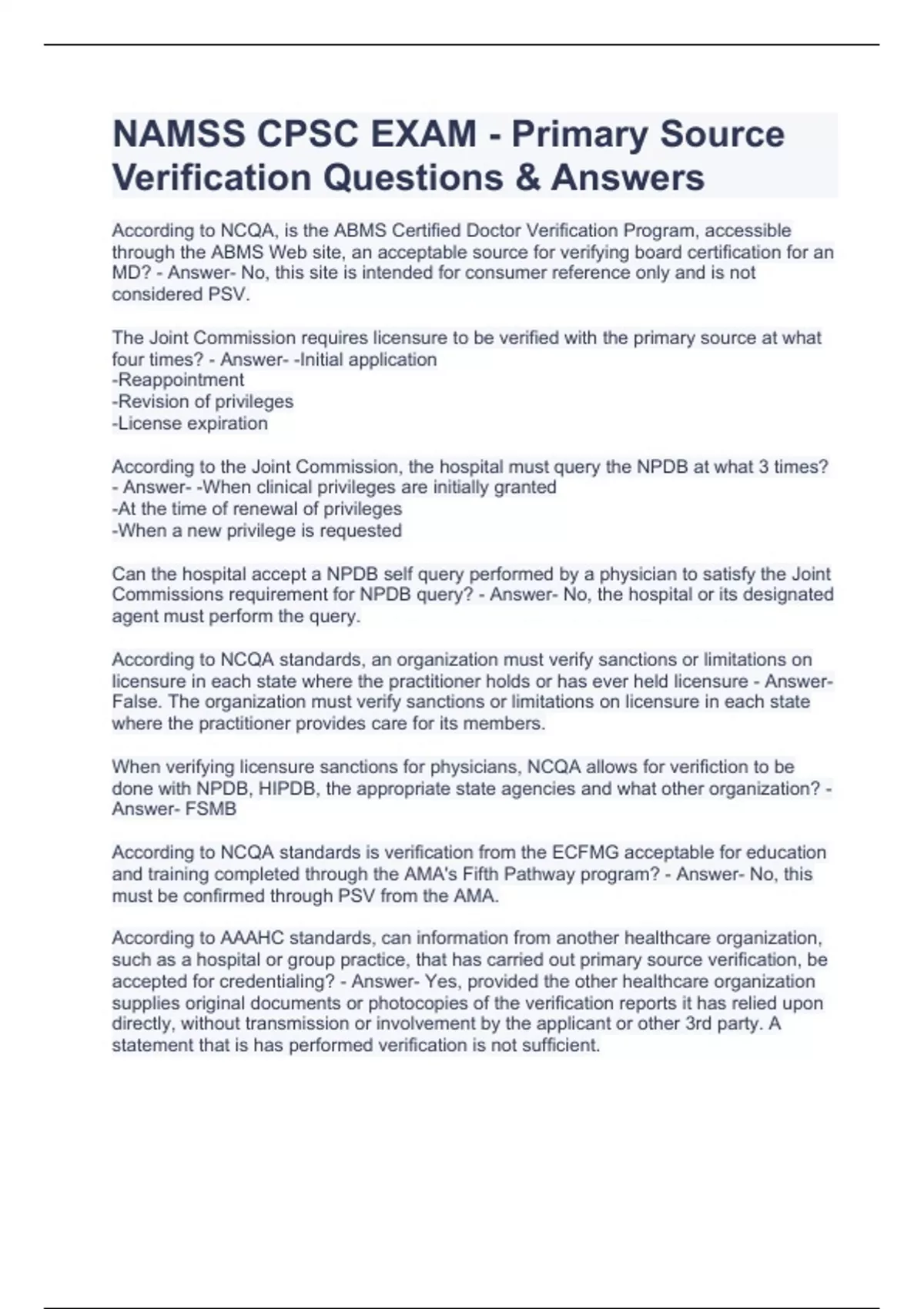 NAMSS CPSC EXAM - Primary Source Verification Questions & Answers