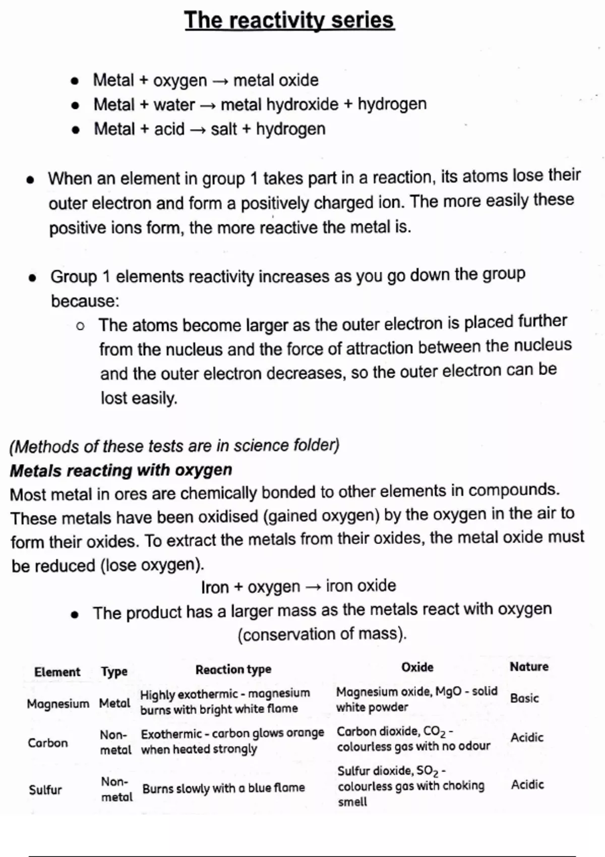 Summary GCSE Combined Science Chemistry - reactions of metals