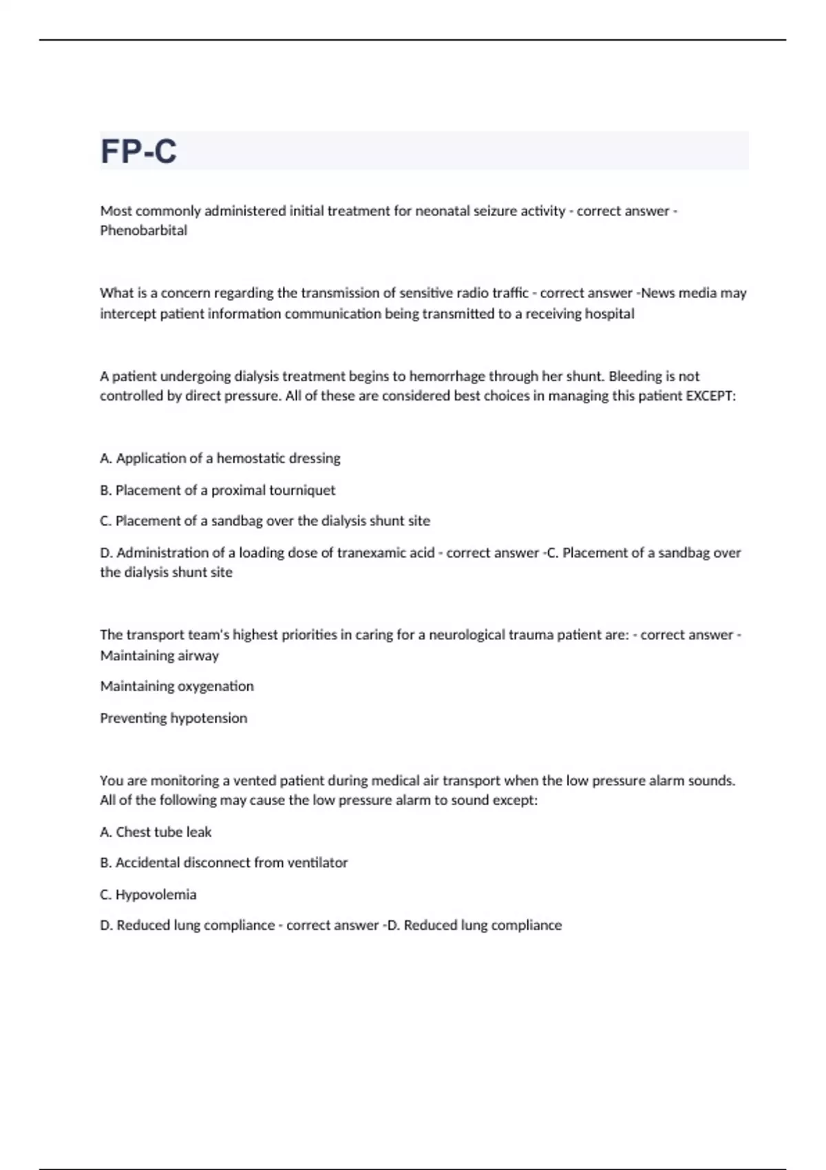 Most commonly administered initial treatment for neonatal seizure activity Phenobarbital What is a concern regarding the transmission of sensitive radio traffic News media may intercept patient information communication being transmitted to a receiving hospital A patient undergoing dialysis treatment begins to hemorrhage through her shunt. Bleeding is not controlled by direct pressure. All of these are considered best choices in managing this patient EXCEPT: A. Application of a hemostatic dressing B. Placement of a proximal tourniquet C. Placement of a sandbag over the dialysis shunt site D. Administration of a loading dose of tranexamic acid C. Placement of a sandbag over the dialysis shunt site The transport team's highest priorities in caring for a neurological trauma patient are: Maintaining airway Maintaining oxygenation Preventing hypotension You are monitoring a vented patient during medical air transport when the low pressure alarm sounds. All of the following may cause the low pressure alarm to sound except: A. Chest tube leak B. Accidental disconnect from ventilator C. Hypovolemia D. Reduced lung compliance D. Reduced lung compliance A chest x-ray has just been completed to confirm correct placement of an endotracheal tube. All of the following x-ray findings indicate successful placement of an ETT except: A. Murphy's eye can be visualized where the clavicles meet B. Murphy's eye can be seen in the upright position C. The distal tip of the ETT can be seen at the level of the T3 to T4 vertebrae D. The distal tip of the ETT is located 4 to 5 cm above the carina B. Murphy's eye can be seen in the upright position
