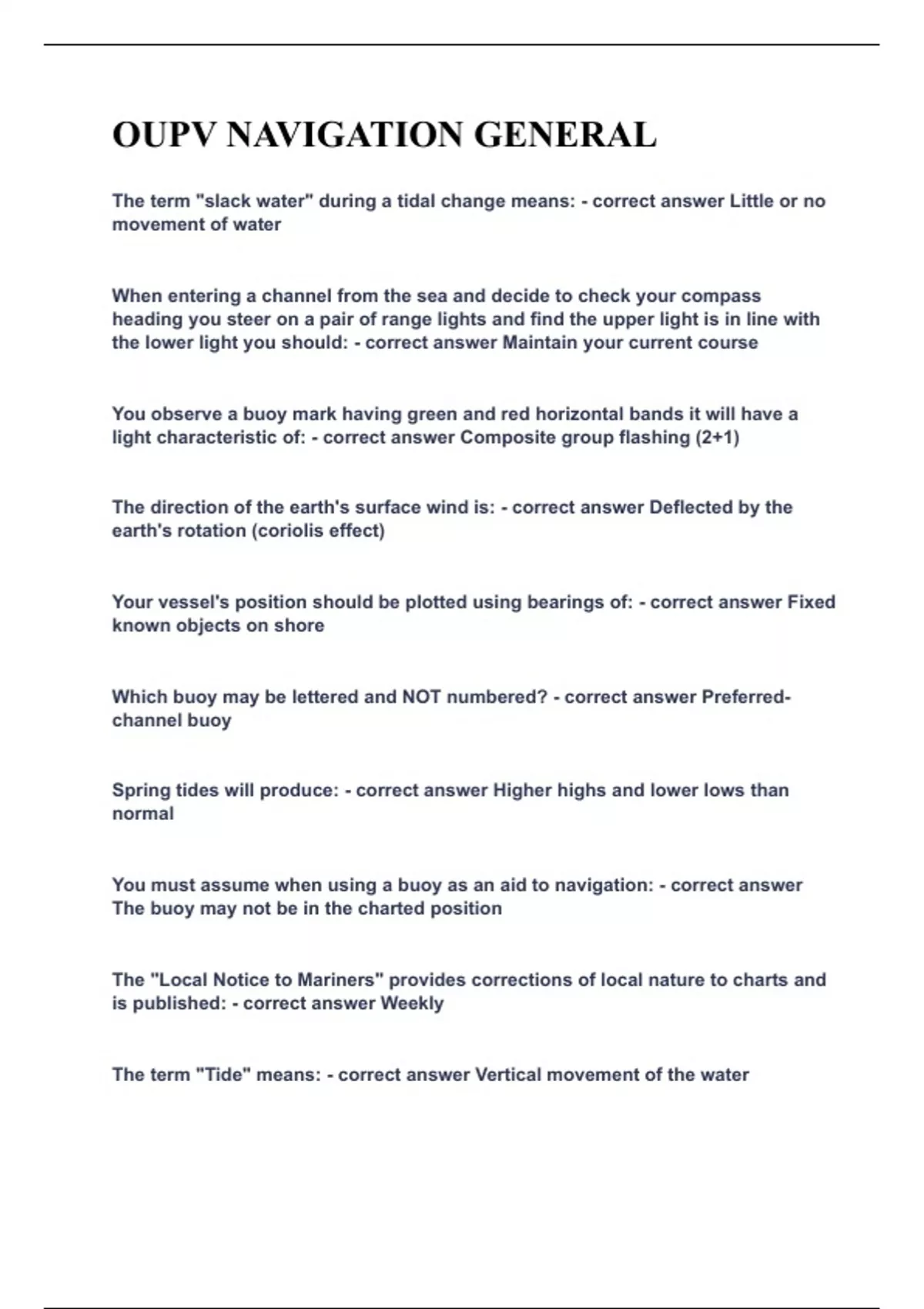 The term "slack water" during a tidal change means: Little or no movement of water When entering a channel from the sea and decide to check your compass heading you steer on a pair of range lights and find the upper light is in line with the lower light you should: Maintain your current course You observe a buoy mark having green and red horizontal bands it will have a light characteristic of: Composite group flashing (2+1) The direction of the earth's surface wind is: Deflected by the earth's rotation (coriolis effect) Your vessel's position should be plotted using bearings of: Fixed known objects on shore Which buoy may be lettered and NOT numbered? Preferred-channel buoy Spring tides will produce: Higher highs and lower lows than normal You must assume when using a buoy as an aid to navigation: The buoy may not be in the charted position The "Local Notice to Mariners" provides corrections of local nature to charts and is published: Weekly The term "Tide" means: Vertical movement of the water When plotting a voyage, you should: Never rely on a floating buoy to maintain its exact position the difference in height between high tide and low tide: Range of tide From seaward the IALA Region B red and green horizontally-banded buoys refer to: Preferred channels Determining the heights of the land features on most charts unless otherwise stated the "reference datum" is: Mean high water Red or green lights may appear on: Horizontally banded buoys The depth of the water on the chart is the: Vertical distance from the chart sounding datum to the ocean bottom A North Hemisphere wind which shifts in a counter clockwise motion is called a: Backing wind A vessel's position acquired by using at least three or more bearings are called a: Fix Mean lower low water (MLLW) is the reference plane used for: Sounding on the U.S. east and west coasts A single line of position combined with a dead-reckoning position results in a(n): Estimated position The sun and moon align twice each month--what type of tides can be expected? Spring A buoy mark with a composite group-flashing light indicated a: Preferred channel On the U.S. east and west coasts charted depths are taken from: Mean lower low water A weather forecast expects a "backing" wind. In the Northern Hemisphere, this would indicate that it will: Shift in a counter clockwise manner What type of tides occur when the sun and moon are at right angles (90 degrees) to each other? Neap If lighted preferred-channel buoy will show a: Composite group-flashing (2+1) red or green light A weather forecast expects a "veering" wind. In the Northern Hemisphere, this would indicate that it will: Shift in a clockwise manner The length of a lunar day is: About 50 minuted longer than the solar day A lighted preferred-channel buoy may show a: Composite group-flashing light To determine the depth of the water--what should you apply to your depth finder reading? Add the draft of the vessel