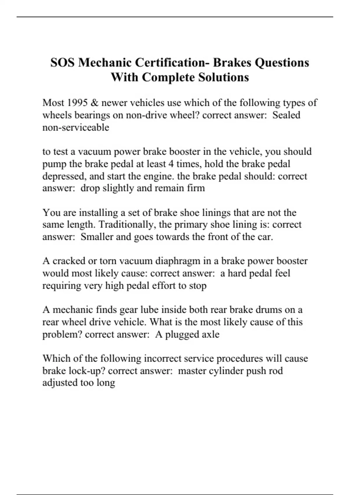 SOS Mechanic Certification- Brakes Questions With Complete Solutions