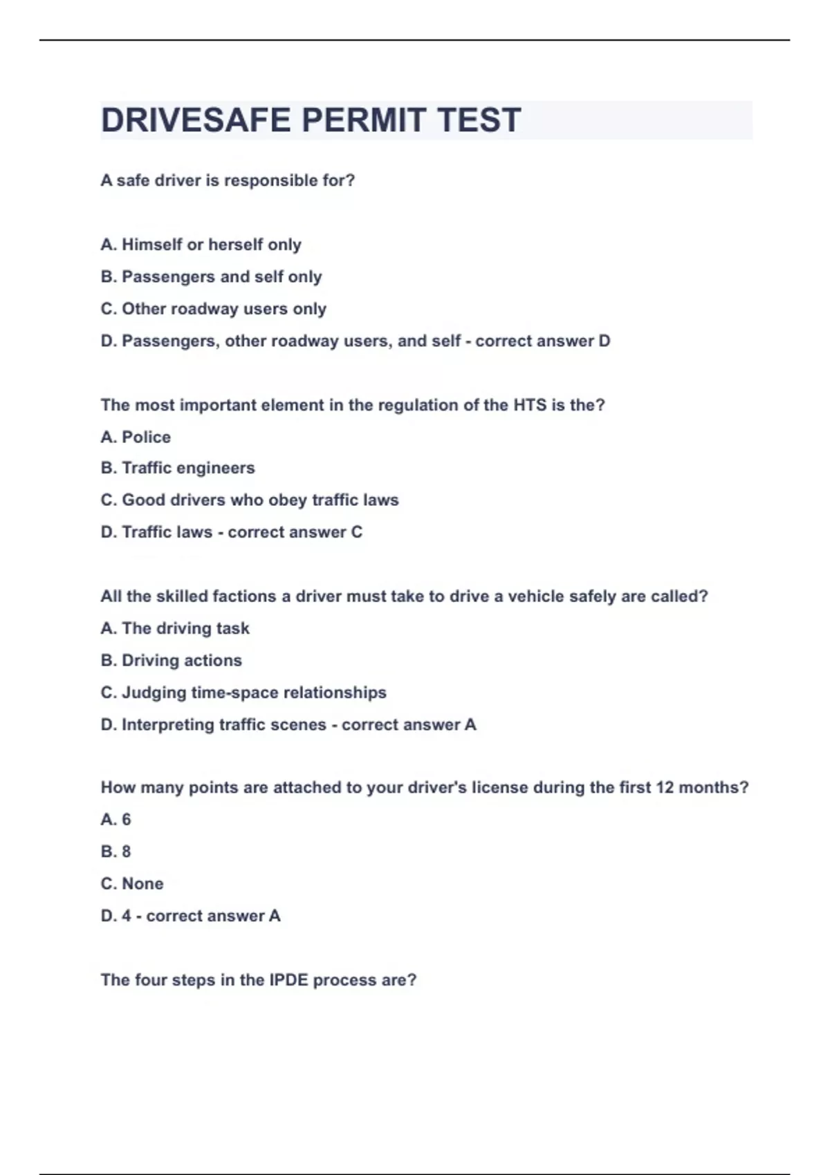A safe driver is responsible for? A. Himself or herself only B. Passengers and self only C. Other roadway users only D. Passengers, other roadway users, and self D The most important element in the regulation of the HTS is the? A. Police B. Traffic engineers C. Good drivers who obey traffic laws D. Traffic laws C All the skilled factions a driver must take to drive a vehicle safely are called? A. The driving task B. Driving actions C. Judging time-space relationships D. Interpreting traffic scenes A How many points are attached to your driver's license during the first 12 months? A. 6 B. 8 C. None D. 4 A The four steps in the IPDE process are? A. Identify, predict, discover, execute B. Identify, predict, decide, execute C. Identify, predict, delay, estimate D. Identify, prepare, defend, estimate B What is the most common cause of most collisions? A. Driver error B. Bad roadways C. Defective vehicles D. Heavy traffic A Protecting yourself and others while driving means you are practicing? A. Obeying natural laws B. Preventive maintenance C. Offensive driving D. Defensive driving D Which of the following driver reactions is NOT that of a defensive driver? A. Adjusts to changing weather and roadway conditions B. Anticipates actions of other roadway users C. Tries to avoid conflict D. Pays little attention to other roadway users D Most states have laws requiring drivers to be financially responsible to pay for? A. Fuel to get to their destination safely B. Vehicle repairs caused by their own negligence C. Property damage and injuries they cause to other people D. Vehicle loans needed to replace their damaged vehicles C What is something you might not first consider part of the HTS? A. The light rail B. An airplane C. A railroad train D. A skateboard A A driver who refuses to take a breathalyzer test may lose their license under which program? A. Highway protection act B. Express consent C. Financial responsibility D. Provisional license B When driving in traffic, a defensive driver expects? A. Unexpected driving situations B. There will be few, if any changes C. All situations will turn out favorably D. Traffic to be completely predictable A The high collision rate of new drivers is due mostly to? A. A lack of traffic enforcement B. Use of older vehicles C. Low minimum licensing age D. Lack of experience D Developing good attitudes towards driving leads to becoming? A. A competitive driver B. An attention getter C. A safe driver D. An offensive driver C What is true of most collisions? A. They just happen B. They are caused by bad luck C. They usually result from several causes D. They usually have one major cause C If your name or address changes you need to notify the DMV? A. By your next birthday B. Within 30 days C. Before license expires D. That you have assumed an alias B A driver education course? A. Teaches you everything you will ever need to know about safe driving B. Guarantees you will be a safe driver C. Is not necessary if you already know how to drive D. Gives you a good start toward becoming a safe and skillful driver D A collision occurs at night between a vehicle with a dirty windshield and one driver by an upset driver. This example illustrates? A. Most collision have a number of causes B. Accidents just happen C. Collision are always one person's fault D. Poor drivers cause most collisions A The purposes of traffic signs are? A. To direct, to decide to stop. B. To regulate, to warn, to guide C. To observe, to direct, to guide D. To stop, to warn, to decide B The basic speed law requires you to drive? A. A safe speed for existing conditions B. Within 5 mph of the speed limit C. At the maximum posted speed D. Above the posted speed limit B