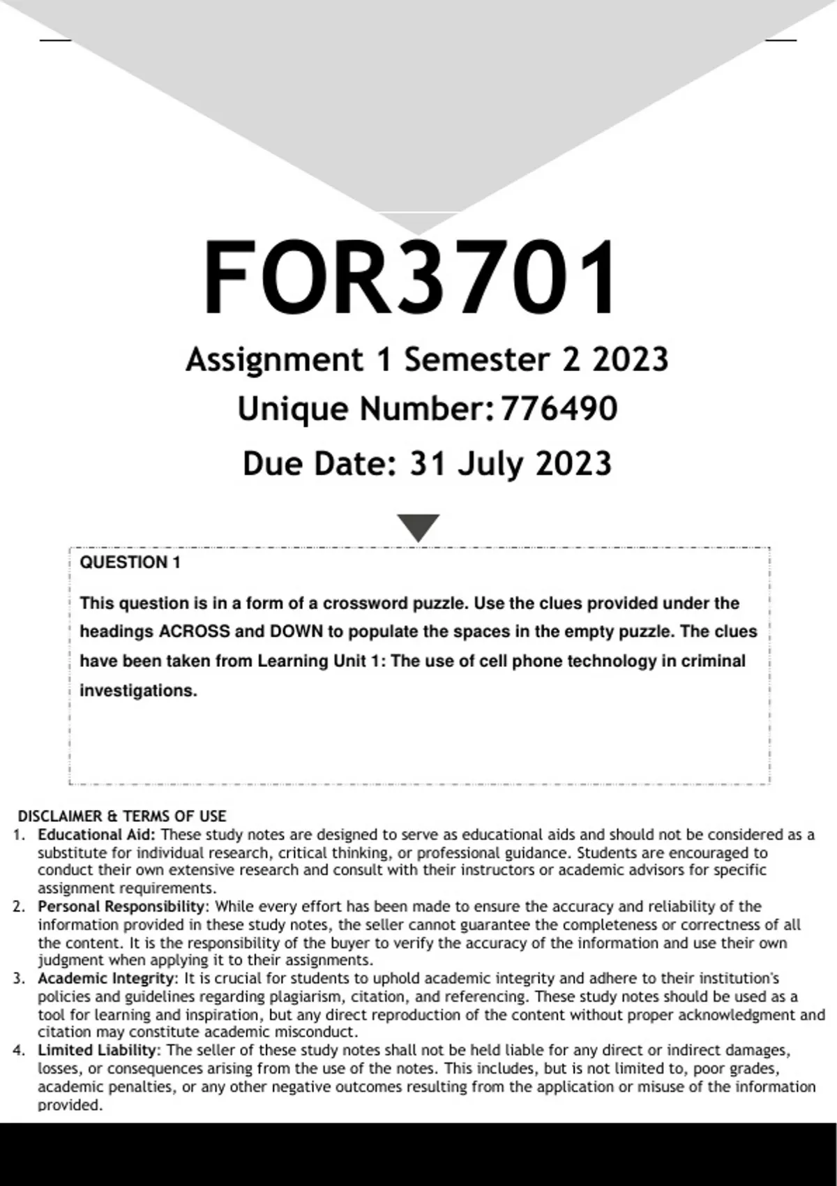Well-structured FOR3701 Assignment 1 (ANSWERS) Semester 1 2024 - DISTINCTION GUARANTEED. (DETAILED ANSWERS - DISTINCTION GUARANTEED!). Question 1 According to the information on the module site, who is the primary lecturer of this module and what are their contact details? (1) CASE STUDY Tributes pour in for second victim in AKA fatal shooting, book author & celeb chef Tebello 'Tibz' Motsoane Rapper Kiernan Jarryd Forbes, popularly known as AKA, was murdered in Durban in February 2023. Kiernan “AKA” Forbes was followed from his airport landing hours before his 10 February 2023 killing as part of an elaborate assassination plot hatched by six arrested suspects, police revealed late on Tuesday. KwaZulu-Natal police commissioner Lieutenant-General Nhlanhla Mkhwanazi announced that one more suspect would be arrested for the murder of AKA, who was shot with his friend and business partner Tebello “Tibz” Motsoane outside a Florida Road, Durban, restaurant in an alleged hit. Forbes was the main target, said the commissioner. “The spotter initially followed Mr Forbes from the airport on arrival…to the hotel, as well as the restaurant where the incident happened,” Mkhwanazi said. “This person [who followed AKA] was also responsible for hiring [and] gathering resources together, the whole team together, as well as the 3 rewards that came thereafter when the people had done their jobs — that payments that were done.” Four vehicles — including a BMW that followed AKA around Durban — and the alleged murder weapon are part of the evidence” (Koko, 2024). Question 2 The following information is fictional and has been designed as part of the case study by the lecturer. As the Task Team leader, you are to lead this investigation. In order to gather evidence of the incident, you access the CCTV footage of the parking area where the crime took place. You notice the presence of a Black SUV with tinted windows to the West side of the scene, prior to the shooting. The license plate is not visible. Immediately after the incident, the driver of the SUV rolled down the window, took a photo of the scene with his cell phone, and sped away, crashing into a lamp pole, as he left the scene. The THREE shooters can be seen fleeing in the opposite direction, in a Grey BMW. In their haste to leave the scene, one of the shooters drops his blue hat; but he does not return to retrieve it. You notice it lying on the ground. The licence plate of the Grey BMW is Noizy-27-ZN. Question 2.1 When considering the physical evidence that may have been left at the scene by the Black SUV, what principle can be applied and how does this principle work? Briefly motivate your answer. (5) Question 2.2 Using the information contained in the case study, recommend any THREE resources that may be of value to find possible evidence left by the perpetrator(s) who fled the scene in the BMW. Explain how each one of these resources will assist in the identification of the perpetrator(s). (6) 4 Question 2.3 If you want to make use of expert evidence, which division/department do you need to contact to attend the scene? Motivate your answer. (3) Question 2.4 Based on your answer in 2.3, may this division/department get involved? Motivate your answer. (2) [16] Question 3 Do you remember a time when there were no cell phones? It seems that most people today have access to or own at least one cellular telephone. This means that wherever they go, they can be tracked. Question 3.1 What is this principle called that is used to trace a person’s movement electronically and how does it work? (4) Question 3.2 Based on your answer in question 3.1, how does one get access to this type of evidence? Motivate your answer. (4) Question 3.3 Based on the information provided, how could you trace the owner of the grey BMW? (2) Question 3.4 Using the information from question 3.3, you trace the owner of the Grey BMW to a premises in Main Road, Durban. Do you think surveillance is an effective investigative technique to gather additional information? Motivate your answer. (3) [13] 5 Question 4 This question is in the form of a crossword puzzle. Use the clues provided under the headings ACROSS and DOWN, to populate the spaces in the empty puzzle. The clues have been taken from the entire study guide. Across 2. surveillance done in secret 5. polygraph detects this 10. cellphone communication is not possible without this 12. investigative technique used by public and private entities 14. a factor that has an impact on the polygraph outcome 15. are determined by the type of surveillance operation 16. a requirement to make a pointing out valid 18. this is how managers help their staff achieve objectives 19. this type of criminal usually only steals specific things 20. pointing out is an additional means to gather this Down 1. also known as a mobile station 3. Latin term that means this 4. this principle is the starting point of an investigation 6. influences the modus operandi of the criminal 7. the signature of a criminal before, during, or after a crime 8. calls are processed here in the network 9. people with this illness should not undergo a polygraph 11. whatever the suspect says during a pointing out may constitute this 13. a disadvantage of surveillance 17. a basic management function