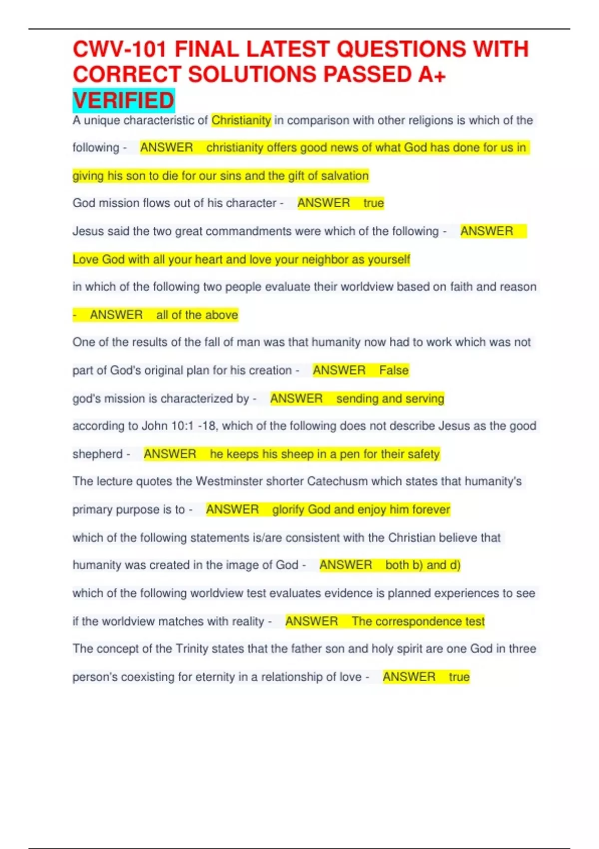 A unique characteristic of Christianity in comparison with other religions is which of the following - ANSWER christianity offers good news of what God has done for us in giving his son to die for our sins and the gift of salvation God mission flows out of his character - ANSWER true Jesus said the two great commandments were which of the following - ANSWER Love God with all your heart and love your neighbor as yourself in which of the following two people evaluate their worldview based on faith and reason - ANSWER all of the above One of the results of the fall of man was that humanity now had to work which was not part of God's original plan for his creation - ANSWER False god's mission is characterized by - ANSWER sending and serving