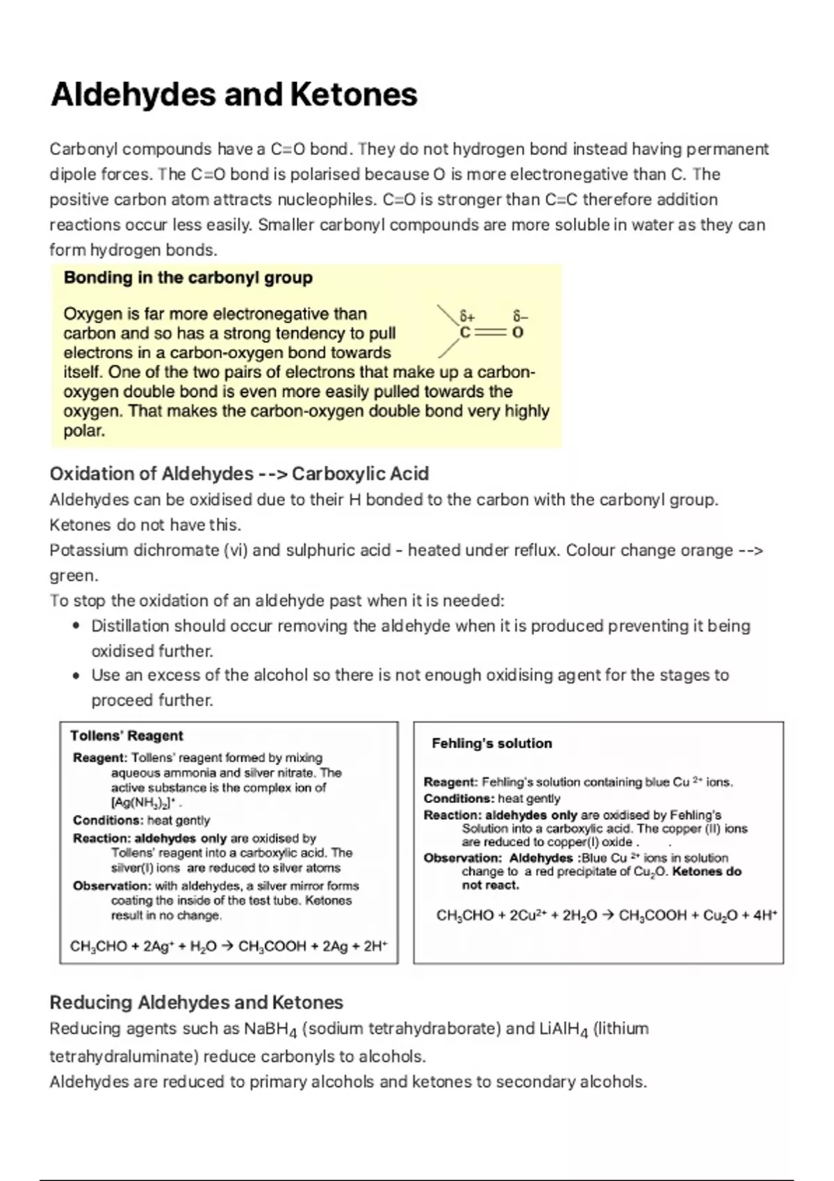 Summary ALEVEL CHEMISTRY - Aldehydes and Ketones Notes