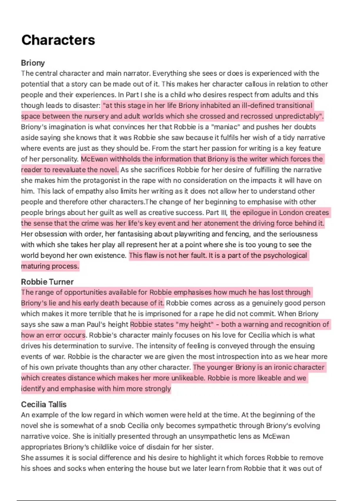 Summary AQA ENGLISH LITERATURE B - CRIME WRITING ATONEMENT NOTES - Characters Notes