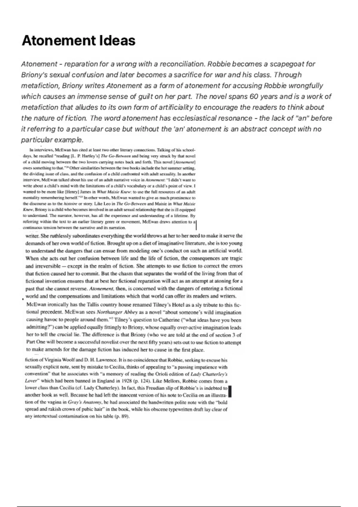 metafiction, Briony writes Atonement as a form of atonement for accusing Robbie wrongfully