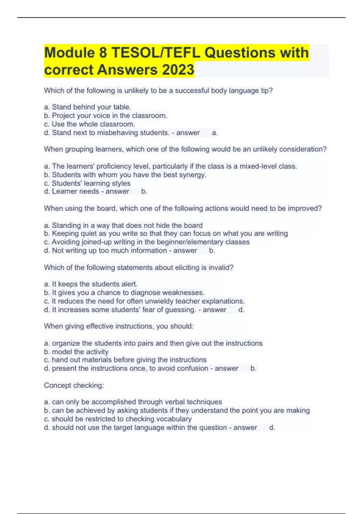 Module 8 TESOL/TEFL Questions with correct Answers 2023 Which of the following is unlikely to be a successful body language tip? a. Stand behind your table. b. Project your voice in the classroom. c. Use the whole classroom. d. Stand next to misbehaving students. a. When grouping learners, which one of the following would be an unlikely consideration? a. The learners' proficiency level, particularly if the class is a mixed-level class. b. Students with whom you have the best synergy. c. Students' learning styles d. Learner needs b. When using the board, which one of the following actions would need to be improved? a. Standing in a way that does not hide the board b. Keeping quiet as you write so that they can focus on what you are writing c. Avoiding joined-up writing in the beginner/elementary classes d. Not writing up too much information b. Which of the following statements about eliciting is invalid? a. It keeps the students alert. b. It gives you a chance to diagnose weaknesses. c. It reduces the need for often unwieldy teacher explanations. d. It increases some students' fear of guessing. d. When giving effective instructions, you should: a. organize the students into pairs and then give out the instructions b. model the activity c. hand out materials before giving the instructions d. present the instructions once, to avoid confusion b. Concept checking: a. can only be accomplished through verbal techniques b. can be achieved by asking students if they understand the point you are making c. should be restricted to checking vocabulary d. should not use the target language within the question d. Feedback: a. is always verbal b. focuses fully on learners' language or skills c. is always given to individuals, not groups d. motivates learners when they are doing well d. Constructive feedback means only giving positive feedback. True or False? False In relation to giving constructive feedback, which of the following is invalid? a. Refer to behavior that can be changed. b. Be evaluative rather than descriptive. c. You need to own the feedback. d. Try to be specific. b. When correcting writing, try to mark everything. True or False? False When an assessment measures what it is supposed to measure, it is: a. fair b. reliable c. valid d. sufficient c. Always be aware that in the EFL/ESOL classroom effective communication with an appropriate response is often more important than grammatical accuracy. True or False? True One of the primary aims of standardization is, where possible, to improve: a. flexibility b. practicability c. reliability d. results c. In the assessment arena: a. summative assessment is a more informal type of assessment b. summative assessment can reflect and evaluate the efficiency of learning in its process c. formative assessment is a more formal type of assessment d. formative assessment can reflect and evaluate the efficiency of learning in its process d. Which of the following is unlikely to be regarded as summative assessment activity? a. You dictate a passage and the learners write down a set of words. b. You give the learners a sentence and they rewrite it, incorporating a change of expression but preserving the basic meaning. c. You get feedback from your learners about their learning. d. You omit words from a passage and your learners have to choose, from a list, the correct words to fill the gaps. c.