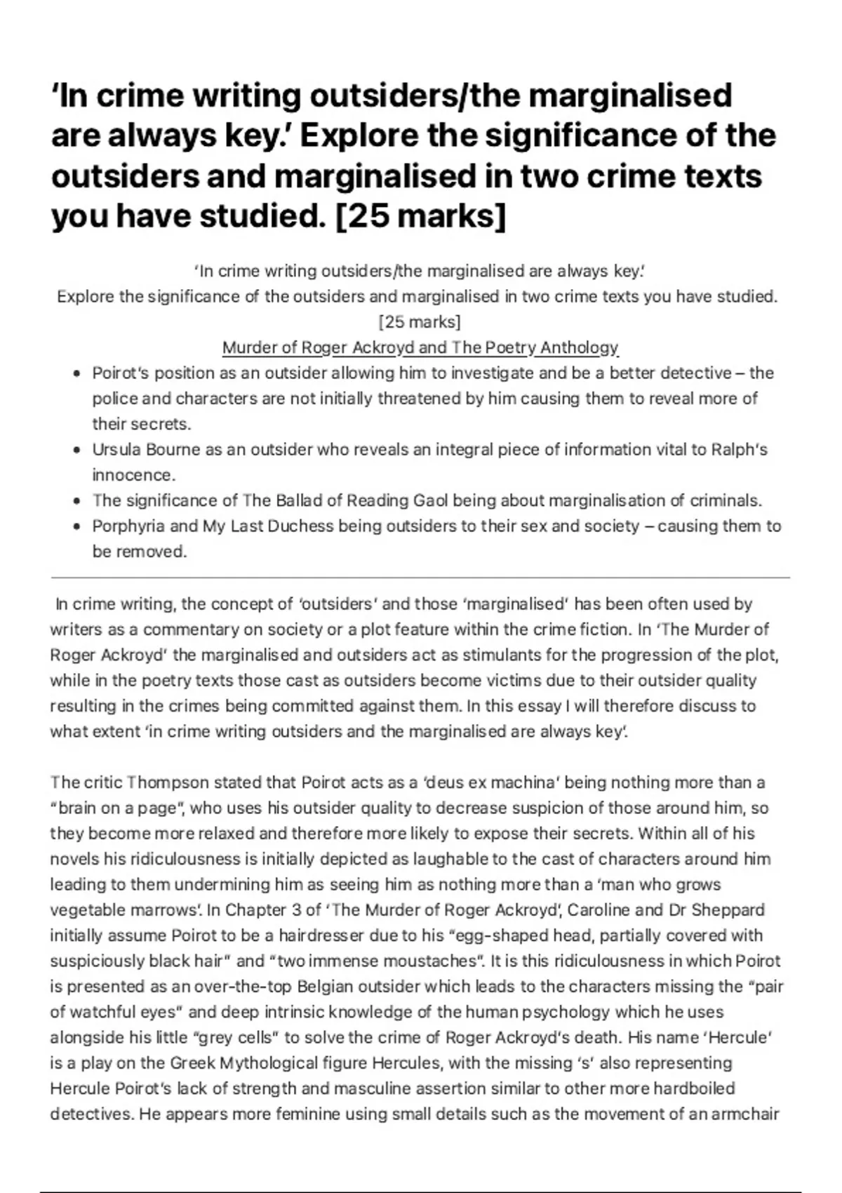 Summary A* ENGLISH LITERATURE CRIME WRITING PART B COMPARISON ESSAY - MURDER OF ROGER ACKROYD AND POETRY ANTHOLOGY ‘In crime writing outsiders/the marginalised are always key.’ Explore the significance of the outsiders and marginalised in two crime texts you have