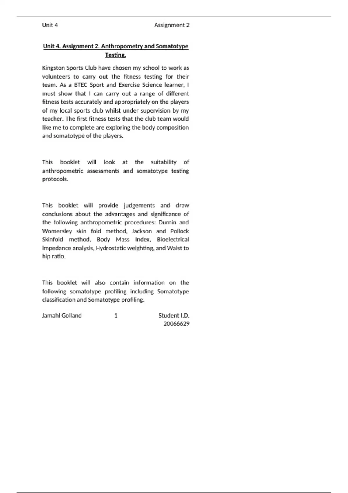 Unit 4. Assignment 2. Anthropometry and Somatotype Testing. Booklet.