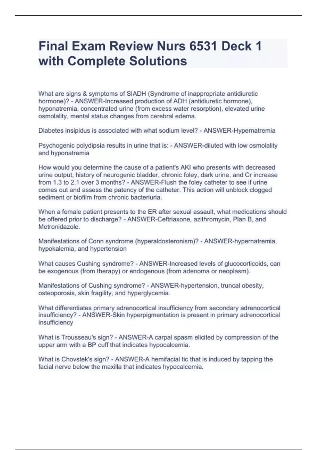 Final Exam Review Nurs 6531 Deck 1 with Complete SolutionsFinal Exam Review Nurs 6531 Deck 1 with Complete SolutionsFinal Exam Review Nurs 6531 Deck 1 with Complete Solutions What are signs & symptoms of SIADH (Syndrome of inappropriate antidiuretic hormone)? - ANSWER-Increased production of ADH (antidiuretic hormone), hyponatremia, concentrated urine (from excess water resorption), elevated urine osmolality, mental status changes from cerebral edema. Diabetes insipidus is associated with what sodium level? - ANSWER-Hypernatremia Psychogenic polydipsia results in urine that is: - ANSWER-diluted with low osmolality and hyponatremia How would you determine the cause of a patient's AKI who presents with decreased urine output, history of neurogenic bladder, chronic foley, dark urine, and Cr increase