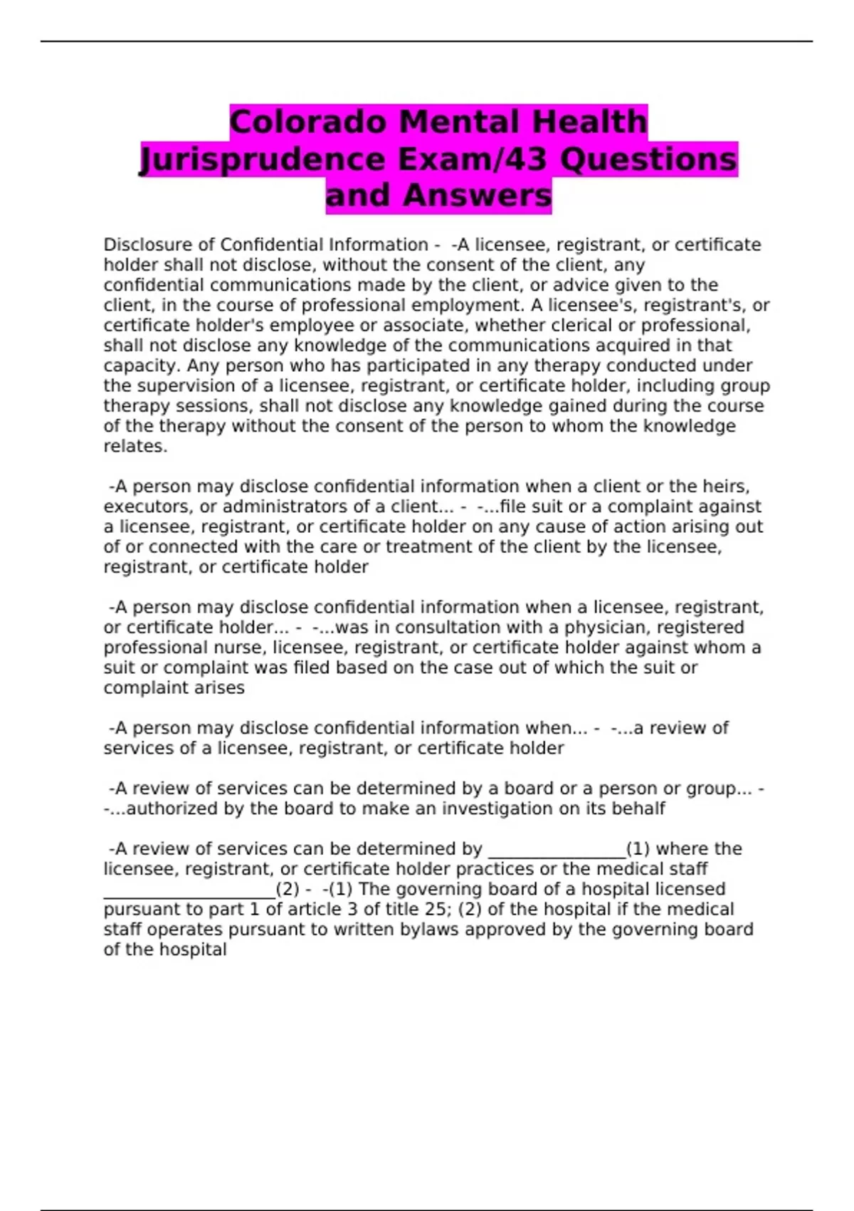 Colorado Mental Health Jurisprudence Exam/43 Questions and Answers