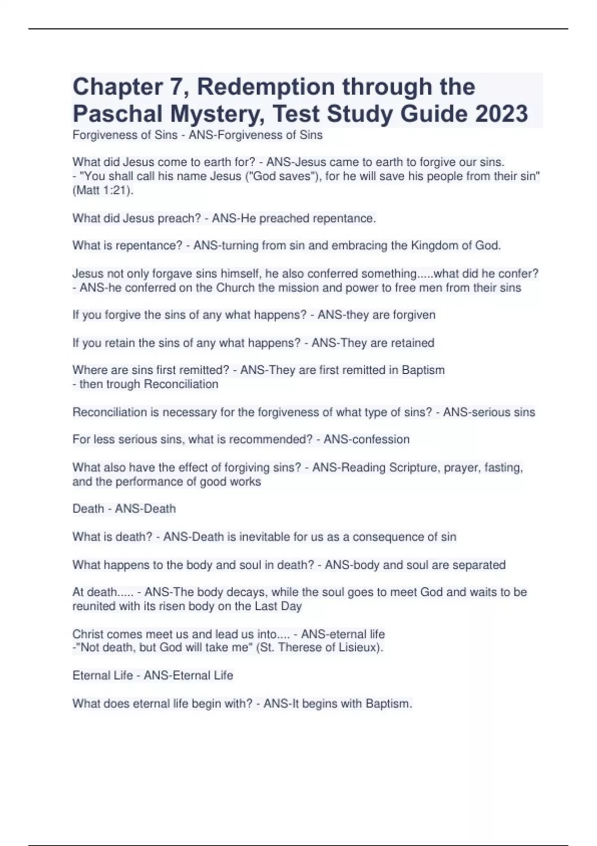 Chapter 7, Redemption through the Paschal Mystery, Test Study Guide 2023 Forgiveness of Sins - ANS-Forgiveness of Sins What did Jesus come to earth for? - ANS-Jesus came to earth to forgive our sins. - "You shall call his name Jesus ("God saves"), for he will save his people from their sin" (Matt 1:21). What did Jesus preach? - ANS-He preached repentance. What is repentance? - ANS-turning from sin and embracing the Kingdom of God. Jesus not only forgave sins himself, he also conferred something.....what did he confer? - ANS-he conferred on the Church the mission and power to free men from their sins If you forgive the sins of any what happens? - ANS-they are forgiven If you retain the sins of any what happens? - ANS-They are retained Where are sins first remitted? - ANS-They are first remitted in Baptism - then trough Reconciliation Reconciliation is necessary for the forgiveness of what type of sins? - ANS-serious sins For less serious sins, what is recommended? - ANS-confession What also have the effect of forgiving sins? - ANS-Reading Scripture, prayer, fasting, and the performance of good works Death - ANS-Death What is death? - ANS-Death is inevitable for us as a consequence of sin What happens to the body and soul in death? - ANS-body and soul are separated At death..... - ANS-The body decays, while the soul goes to meet God and waits to be reunited with its risen body on the Last Day Christ comes meet us and lead us into.... - ANS-eternal life -"Not death, but God will take me" (St. Therese of Lisieux). Eternal Life - ANS-Eternal Life What does eternal life begin with? - ANS-It begins with Baptism...