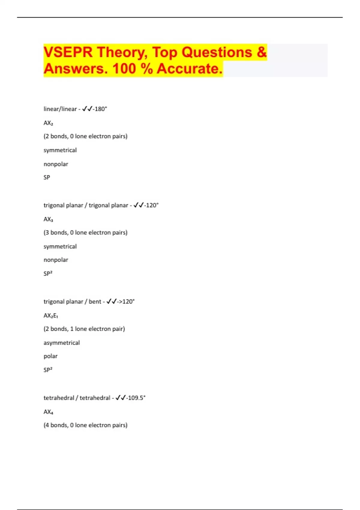 VSEPR Theory, Top Questions & Answers. 100 % Accurate. linear/linear - -180° AX₂ (2 bonds, 0 lone electron pairs) symmetrical nonpolar SP trigonal planar / trigonal planar - -120° AX₃ (3 bonds, 0 lone electron pairs) symmetrical nonpolar SP² trigonal planar / bent - ->120° AX₂E₁ (2 bonds, 1 lone electron pair) asymmetrical polar SP² tetrahedral / tetrahedral - -109.5° AX₄ (4 bonds, 0 lone electron pairs) symmetrical nonpolar SP³ tetrahedral / trigonal pyramidal - ->109.5° AX₂E₁