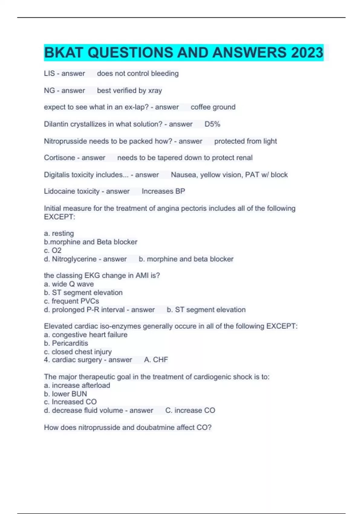 BKAT QUESTIONS AND ANSWERS 2023 LIS does not control bleeding NG best verified by xray expect to see what in an ex-lap? coffee ground Dilantin crystallizes in what solution? D5% Nitroprusside needs to be packed how? protected from light Cortisone needs to be tapered down to protect renal Digitalis toxicity includes... Nausea, yellow vision, PAT w/ block Lidocaine toxicity Increases BP Initial measure for the treatment of angina pectoris includes all of the following EXCEPT: a. resting ine and Beta blocker c. O2 d. Nitroglycerine b. morphine and beta blocker the classing EKG change in AMI is? a. wide Q wave b. ST segment elevation c. frequent PVCs d. prolonged P-R interval b. ST segment elevation Elevated cardiac iso-enzymes generally occure in all of the following EXCEPT: a. congestive heart failure b. Pericarditis c. closed chest injury 4. cardiac surgery A. CHF The major therapeutic goal in the treatment of cardiogenic shock is to: a. increase afterload b. lower BUN c. Increased CO d. decrease fluid volume C. increase CO How does nitroprusside and doubatmine affect CO? a. reduced preload and improved contractility b. increases preload and reduced contractility c. reduced afterload and reduced contractility d. reduces preload and afterload and improves contractiltiy D. reduces preload and afterload and improves contractility. In dealing with a depressed patient during the 1st days post AMI the most appropriate nursing action would be? a. encourage to vent about concerns b. provide privacy c. limit visitors d. provide quiet enviroment a. encourage the pt to vent about concerns Pt recieved TpA 3 hours after AMI. Which of the following would most likely require discontinuing the infusion? a. PVCs. b. bleeding gums c. ooziing at insertion site d. change in mental status d. change in mental status The use of an A-line may be indicated for all of the following except? a. shock with too low BP to be read by cuff b. pt being treated with IV vasopressors c. vented pt requiring frequent ABGs d. for the admin of routine drugs d. for the admin of routine drugs After a a-line is removed pressure should be held for how long? a. 2 minutes b. 5-10 minutes c. until oozing stops d. until pressure dressing is applied b. 5-10 minutes CVP reads what pressure? a. left atrium b. right atrium c. Left ventricle d. pulm. artery b. right atrium an elevated CVP may indicate? a. right HF b. fall in hematocrit c. actue dehydration d. onset of left ventricular failure a. Right HF PAOP reflects pressure where? a. aorta b. left ventricle c. right atrium d. vena cava b. left ventricle Normal PA pressures a. 10-20/ 0-4 - 5-10 b. 21-30/5-15 - 11-20 c. 31-36/ d. 36-45/ B. 21-30/5-15 mean - 11-12 How many mmHg is the noraml PAOP? a. 1-3 b. 6-12 c.15-20 d. 21-26 b. 6-12 (in the book its 8-12) an elevated PAOP may indicate? a. hypovolemia b. peripheral vasodilation c. systemic hypotension d. left ventricular failure d. Left ventricular failure treatment for a-fib/ a-flutter? a. levophed b. nifedipine c. cardizem d. adenosine c. cardizem QRS complex wider than 0.12 seconds most likely indicates? a. NS nod conduction b. BBB c. second degree heart block d. myocardial infarction b. BBB special care should be excersided when adminstering IV dopamine because? a. infiltration leads to tissure necrosis b. high doses may lead to a profound bradycardia c. precipitation can occur when used in a dextrose solution d. even low doses decrease renal perfusion a. infiltration leads to tissue necrosis A strong ventricular stimulation is potentially dangerous when it lands on the: a. u wave b. p wave c. t wave d. QRS complex c. t-wave Indication for use of external cardiac pacemaker include? a. PAT with block b. V-fib c. Wenchbach (Type 1) d. symptomatic complete heart block d. symptomatic complete heart block initial drug treatment for sustained v-tach when a pulse is present is: a. Isuprel 1.0 mg in 250 mL D5W. b. epi 1.0 mg IV push c. atropine 0.5 mg IV push d. Amiodarone 150mg IV over 10 minutes d. amio 150mg IV over 10 minutes the cardiac rhythm of atrial flutter is a. benign condition in most people b. normal following AMI c. hazardous as a ventricular rate may suddenly increase d. hazardous as it may progress to second degree heart block c. hazardous as a ventricular rate may suddenly increase upon recognizing v-fib in a safe enviroment the nurse should then: a. perform a precordial thump b. establish unresponsiveness c. give IV amio d. check EKG leads b. establish unresponsivness. one of the first therapies to be administered in the treatment of complete heart block is? a. atropine b. trancutaneous pacing c metoprolol d. digoxin b. trancutaneous pacing pt is in a flutter with ventricular response of 150 bpm. therapy includes? a. amiodarone, cardizem, cardiovert b. lidocaine, sodium bicard, cardioversion c. digoxin, KCl, pacemaker d. Isodril, nitropaste, amiodarone a. amiodarone, cardizem, cardiovert signs of cardiac tampnade may include all of the following except? a. distended neck veins b. pulsus paradoxus c. decreased SBP d. bradycardia d. bradycardia Pt in V-fib, in 1st defib how many joules do you set it to? monphasic and biphasic? mono- 350 biphasic- 150 pt becomes apneic and pulsesless. the monitor shoes systole. The drug that would most likley be used initially is? a. amio b. atropine c. epi 4. lidocaine c. epi antedote for heparin? protamine sulfate antedote for warfain? vit k an excessive amount of CT draining in the first few hours following surgery is how many ccs? 150 before suctioning a patient, you adjust the vacuum pressure so that it is? a. 120 mmHg of vacuum pressure b. as high as needed to remove secretions c. 40 mmHg of vacuum pressure d. no highter than the DBP a. 120 mmHg of vacuum pressure post op pt has CT on anterior left side, you notice diminished LS on right posterior base. What does this indicate? a. pleuritis b. consolidation c. atelectasis d. the CT c. atelectasis