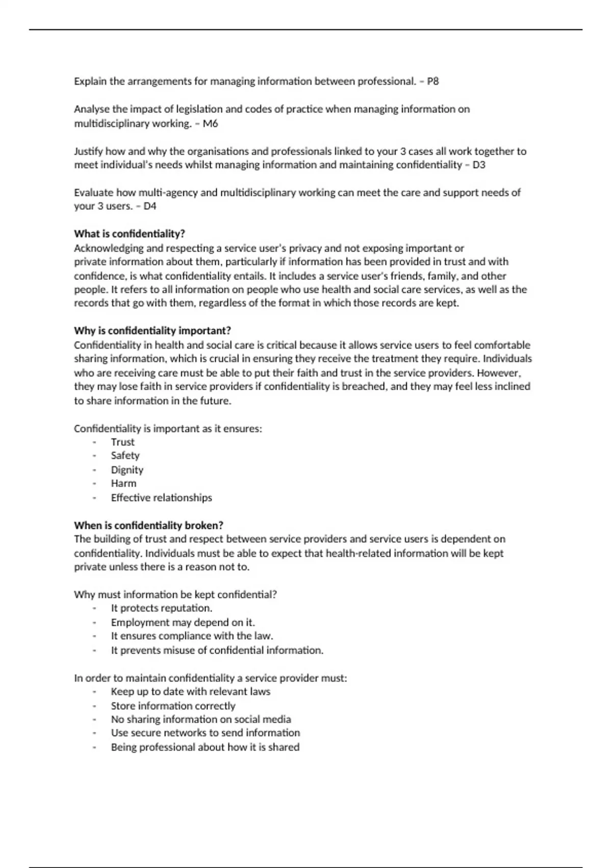 This document covers the importance of confidentiality and data protection for service users in the health sector providing numerous policies, legislations and examples. The document then goes on to expand on the importance of legislations and codes of practice when it comes to maintaining a patient's information and their rights.