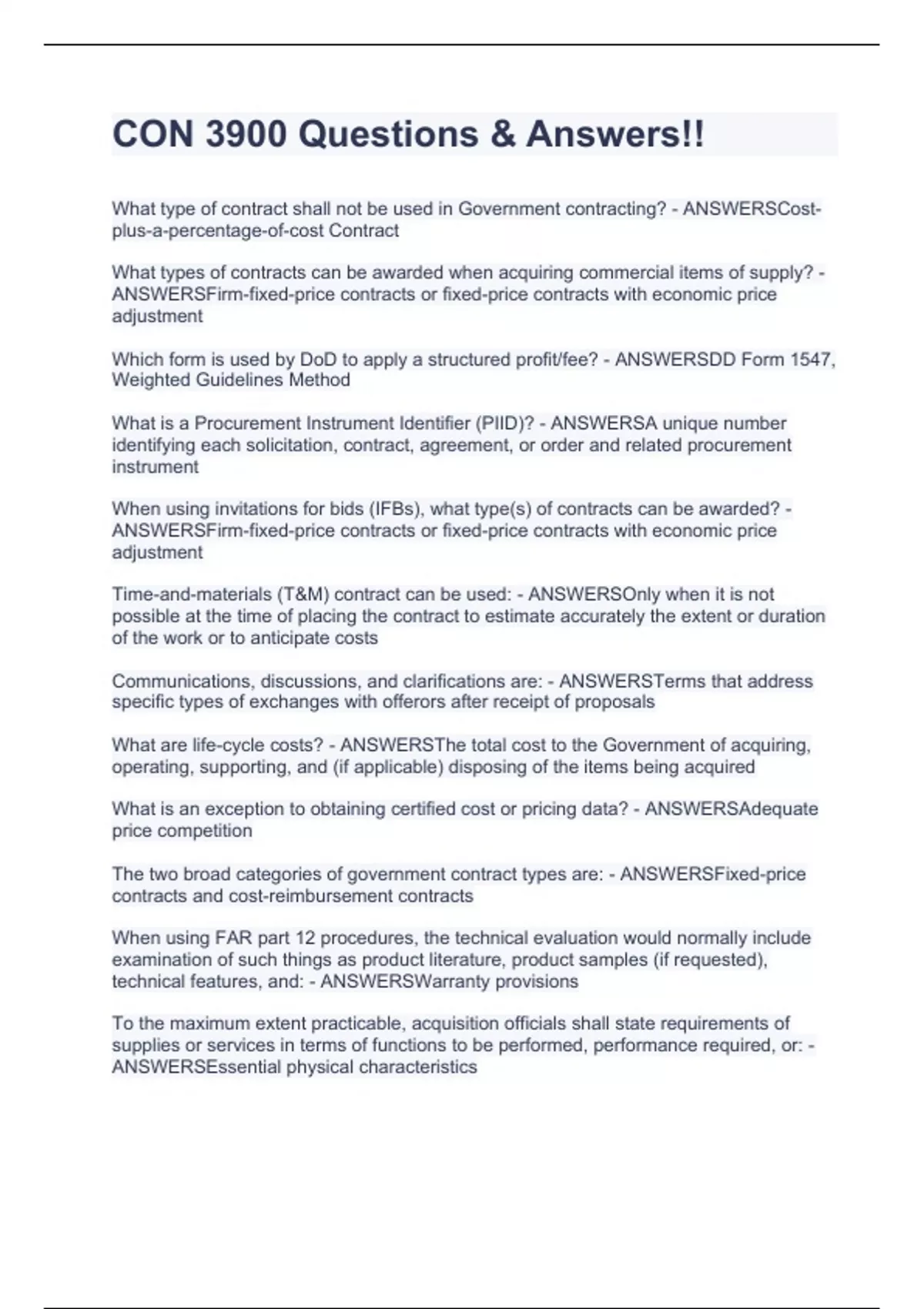 What type of contract shall not be used in Government contracting? - ANSWERSCost-plus-a-percentage-of-cost Contract What types of contracts can be awarded when acquiring commercial items of supply? - ANSWERSFirm-fixed-price contracts or fixed-price contracts with economic price adjustment Which form is used by DoD to apply a structured profit/fee? - ANSWERSDD Form 1547, Weighted Guidelines Method What is a Procurement Instrument Identifier (PIID)? - ANSWERSA unique number identifying each solicitation, contract, agreement, or order and related procurement instrument When using invitations for bids (IFBs), what type(s) of contracts can be awarded? - ANSWERSFirm-fixed-price contracts or fixed-price contracts with economic price adjustment Time-and-materials (T&M) contract can be used: - ANSWERSOnly when it is not possible at the time of placing the contract to estimate accurately the extent or duration of the work or to anticipate costs Communications, discussions, and clarifications are: - ANSWERSTerms that address specific types of exchanges with offerors after receipt of proposals What are life-cycle costs? - ANSWERSThe total cost to the Government of acquiring, operating, supporting, and (if applicable) disposing of the items being acquired What is an exception to obtaining certified cost or pricing data? - ANSWERSAdequate price competition The two broad categories of government contract types are: - ANSWERSFixed-price contracts and cost-reimbursement contracts