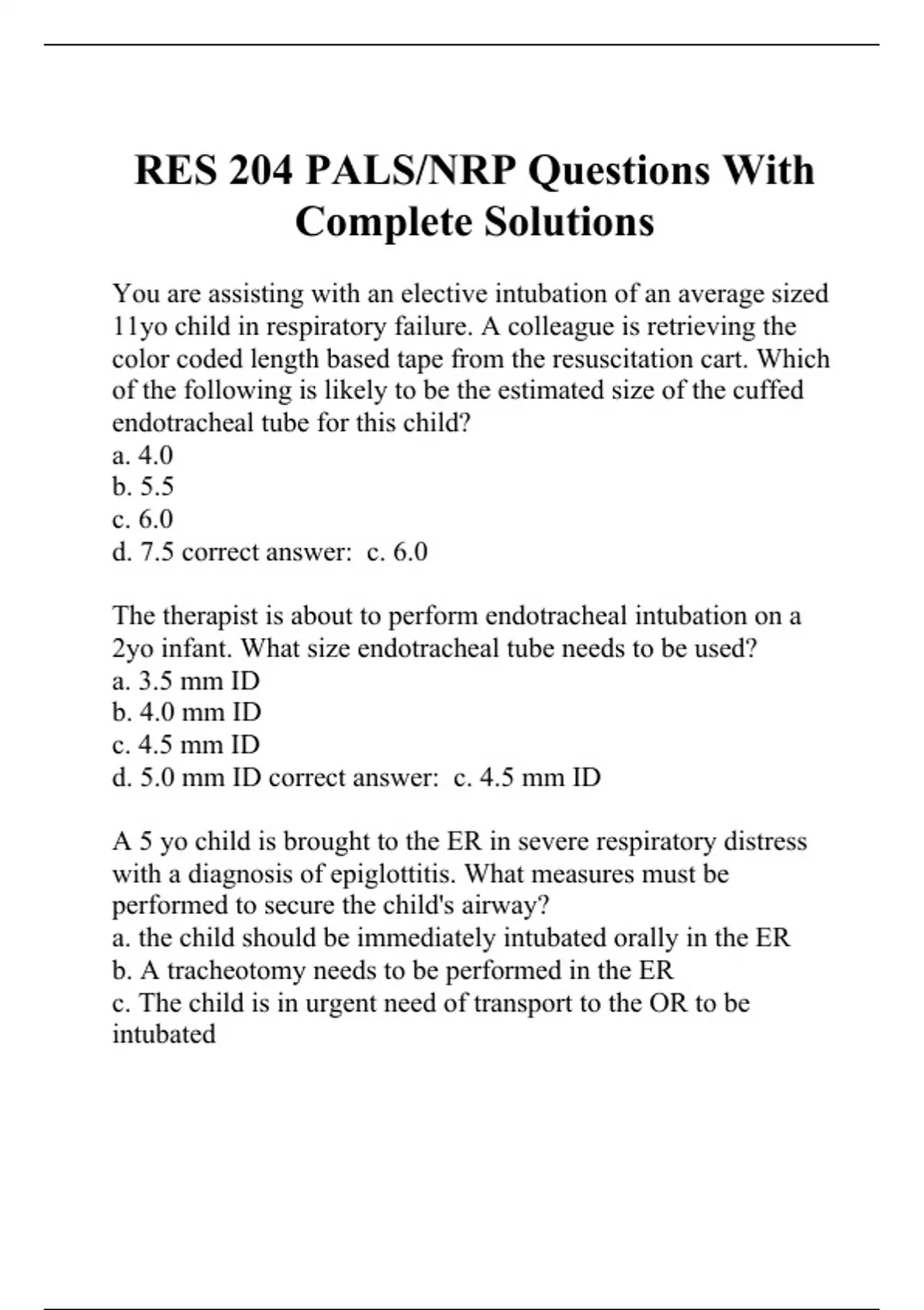 You are assisting with an elective intubation of an average sized 11yo child in respiratory failure. A colleague is retrieving the color coded length based tape from the resuscitation cart. Which of the following is likely to be the estimated size of the cuffed endotracheal tube for this child? a. 4.0 b. 5.5 c. 6.0 d. 7.5 correct answer: c. 6.0 The therapist is about to perform endotracheal intubation on a 2yo infant. What size endotracheal tube needs to be used? a. 3.5 mm ID b. 4.0 mm ID c. 4.5 mm ID d. 5.0 mm ID correct answer: c. 4.5 mm ID A 5 yo child is brought to the ER in severe respiratory distress with a diagnosis of epiglottitis. What measures must be performed to secure the child's airway? a. the child should be immediately intubated orally in the ER b. A tracheotomy needs to be performed in the ER c. The child is in urgent need of transport to the OR to be intubated d. nebulized 2.2% racemic epi needs to be given via face mask every 10 mins correct answer: c. the child is in urgent need of transport to the OR to be intubated which of the following devices would be the most appropriate to use for a 3 yo patient who experiences immediate postextubation hypoxemia? a. blow up setup b. partial rebreather mask c. aerosol mask d. t piece correct answer: c. aerosol mask You are caring for a 6yo patient who is receiving positive pressure mechanical ventilation via an ET T. The child begins to move his head and suddenly becomes cyanotic, and his HR decreases. His SpO2 is 65%. You remove the child from the vent and begin to provide manual ventilation with a bag via the ETT. During manual ventilation with 100% O2, the child's color and HR improve slightly and BP remains adequate. Breath sounds and chest expansion are present and adequate on the right side and are present but consistently diminished on the left side. The trachea is not deviated and the neck veins are not distended. A suction catheter passes easily beyond the tip of the ETT. Which of the following is the most likely cause of this child's acute deterioration? a. equipment failure b. tracheal tube obstruction c. tension penumo on the right side d. tracheal tube displacement into the right main bronchus correct answer: d. tracheal tube displacement into the right main bronchus The drainage bottle is not in the proper position in relationship