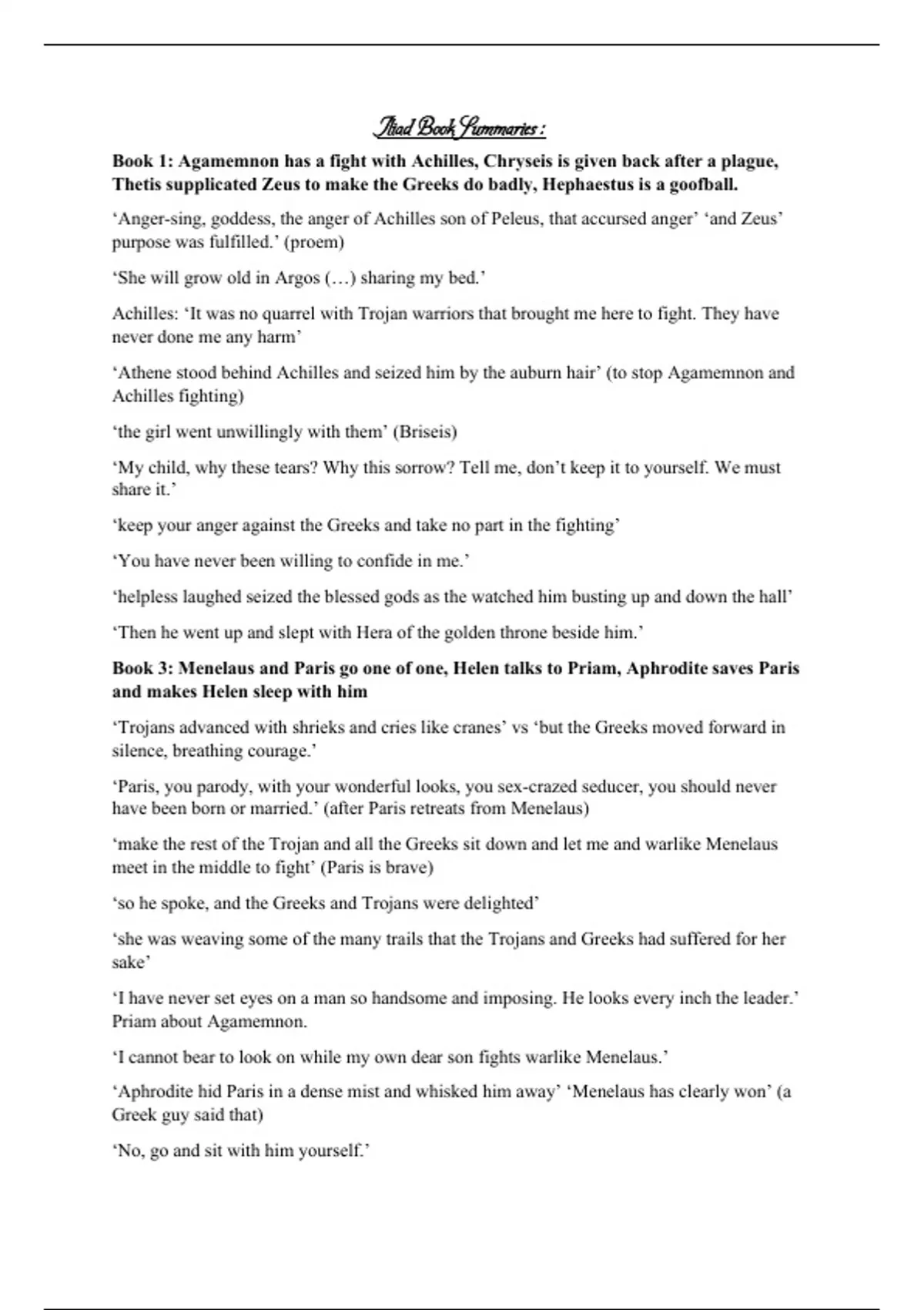 Summaries of what happens in each book of the Iliad with select quotes to show off your knowledge in exams