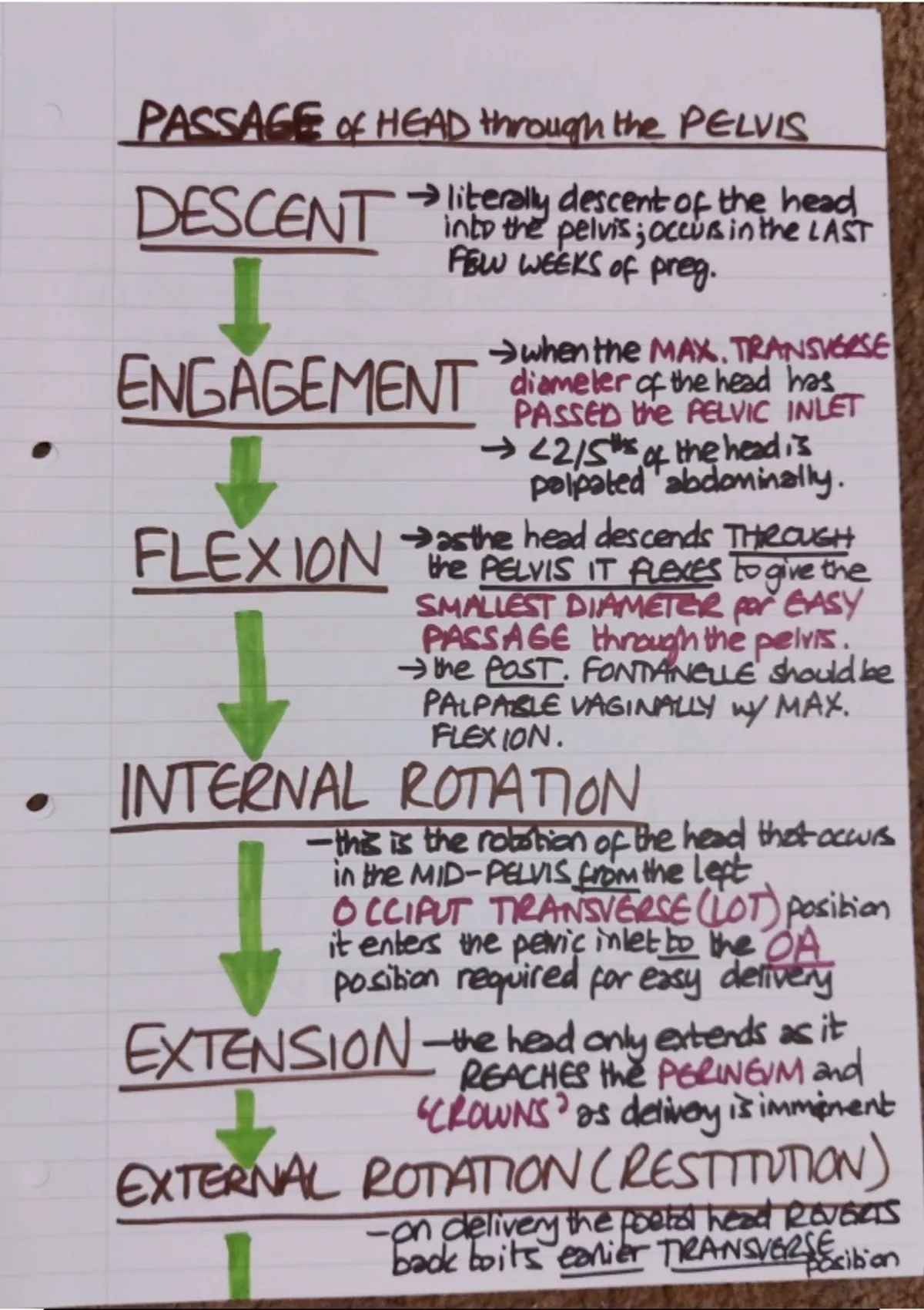 There are several things covered in these notes including: - the 3 stages of labour - the stages of the passage of the head through the pelvis - premature labour including definition, causes, consequences, drugs used and mortality rate - induction of labour including indications and the bishop score - 3 mechanical factors that determine progress during labour including the degree of the force of expelling the foetus, the dimensions of the pelvis and the resistance of the soft tissue as the diameters of the foetal head I have used the following myself for revision for examinations and for consolidating knowledge on my clinical rotations. These have been made from a combination of reading and lecture notes from 4th year medical school lectures for MBBS.