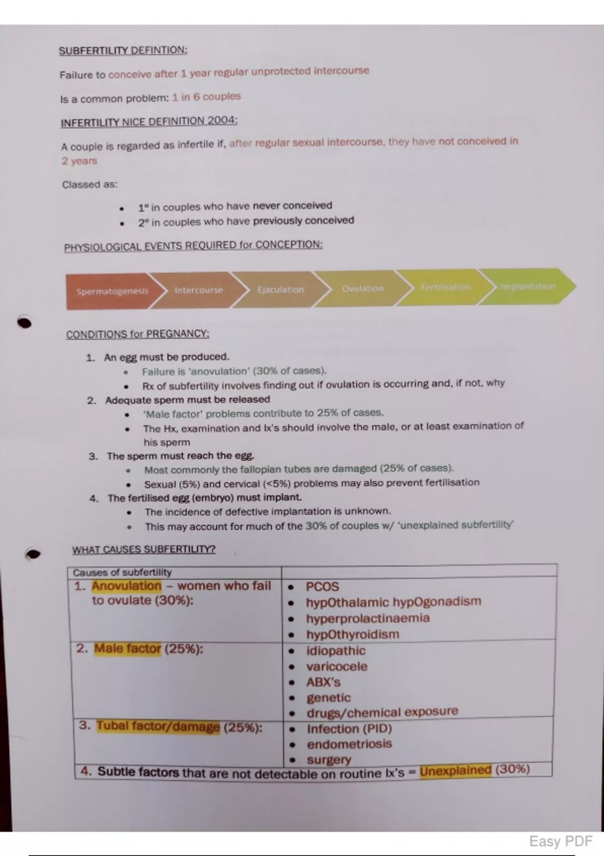 Summary MBBS Subfertility, anovulation and polycystic ovarian syndrome revision notes