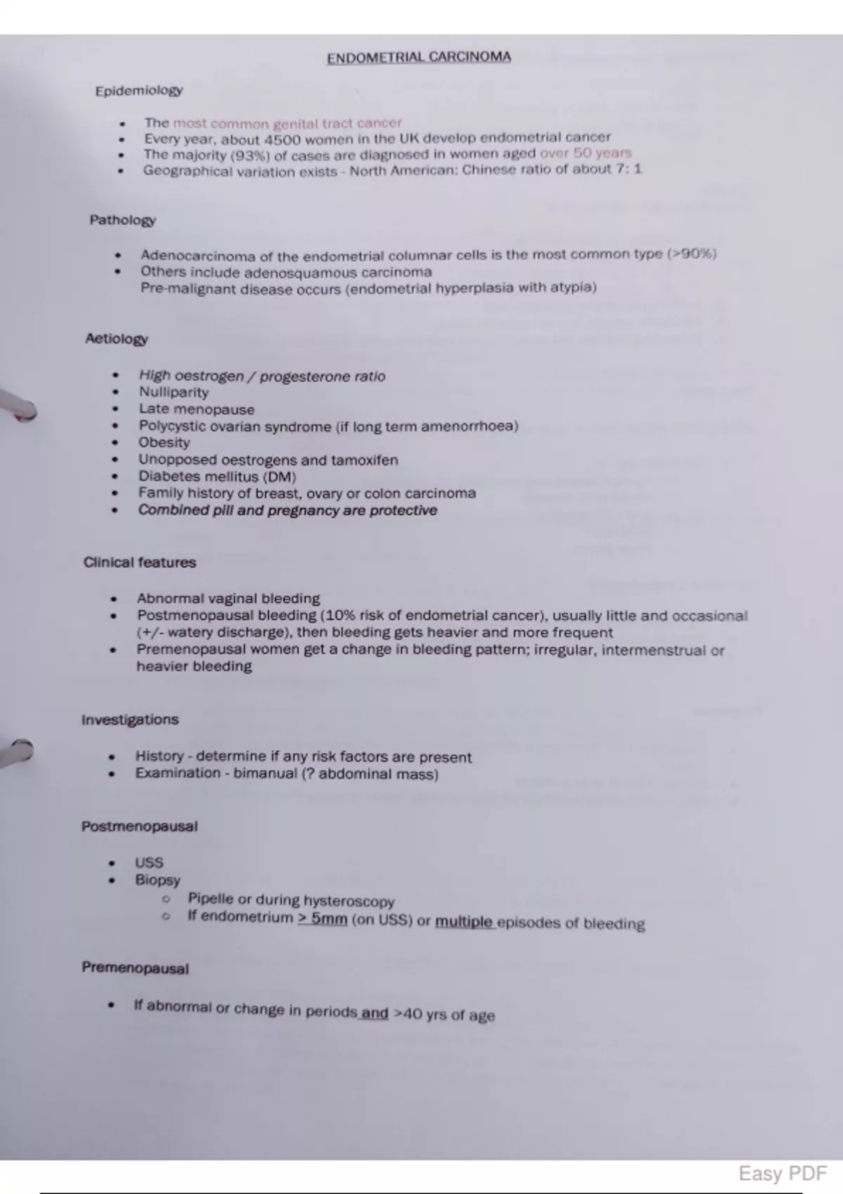 Revision notes including a summary page on endometrial carcinoma including clinical features, pathology, investigations, staging and treatment. Also includes the classification of ovarian tumours split into primary and secondary tumours and tumour-like conditions. Can be used as a aid to gynaecology revision for medical students.