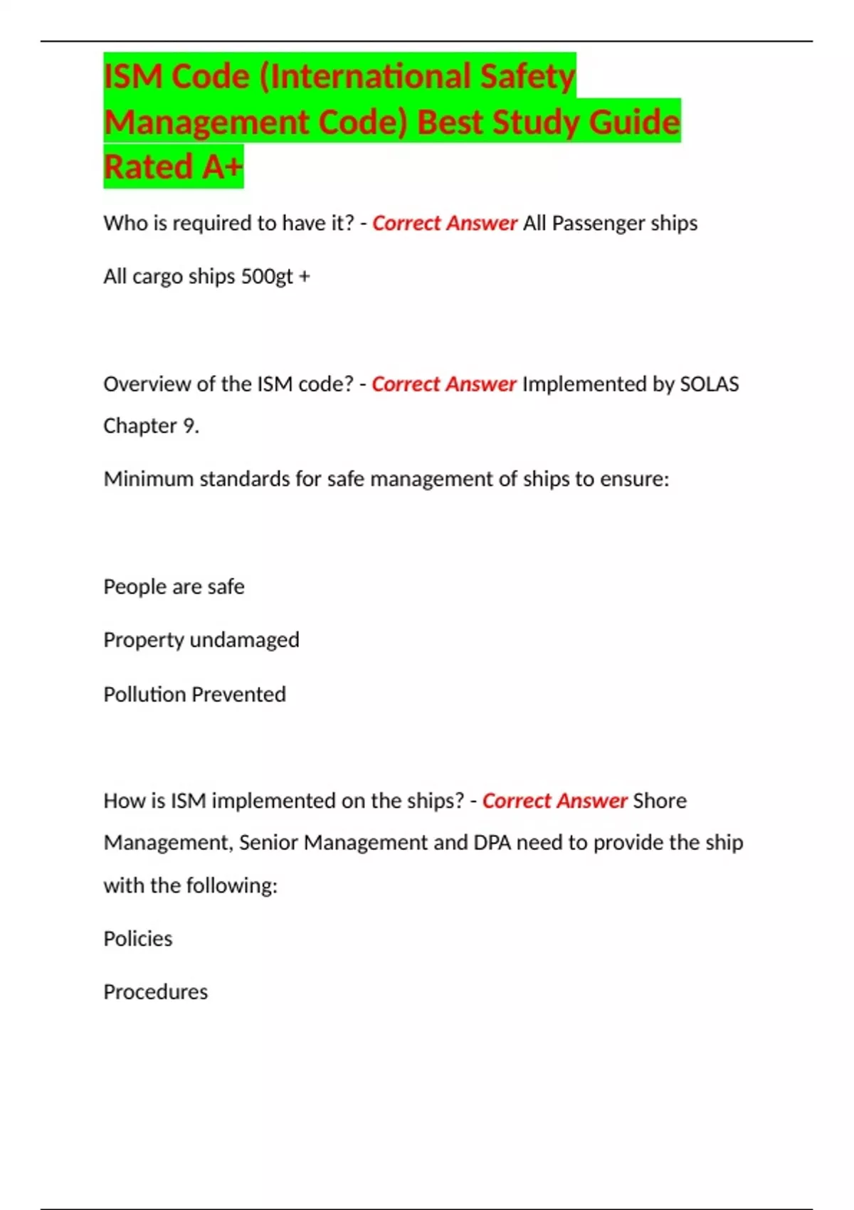 ISM Code (International Safety Management Code) Best Study Guide Rated A+