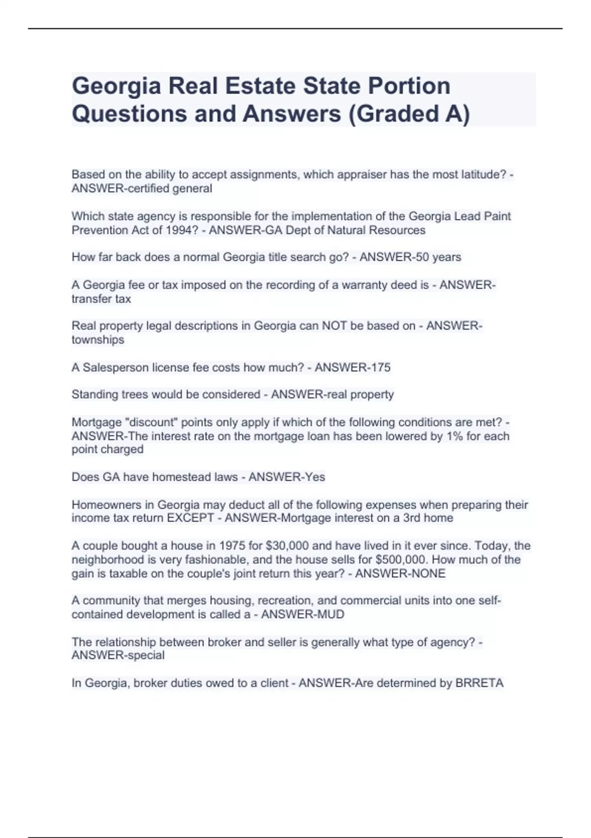 Georgia Real Estate State Portion Questions and Answers (Graded A)Georgia Real Estate State Portion Questions and Answers (Graded A)Georgia Real Estate State Portion Questions and Answers (Graded A)Georgia Real Estate State Portion Questions and Answers (Graded A) Based on the ability to accept assignments, which appraiser has the most latitude? - ANSWER-certified general Which state agency is responsible for the implementation of the Georgia Lead Paint Prevention Act of 1994? - ANSWER-GA Dept of Natural Resources