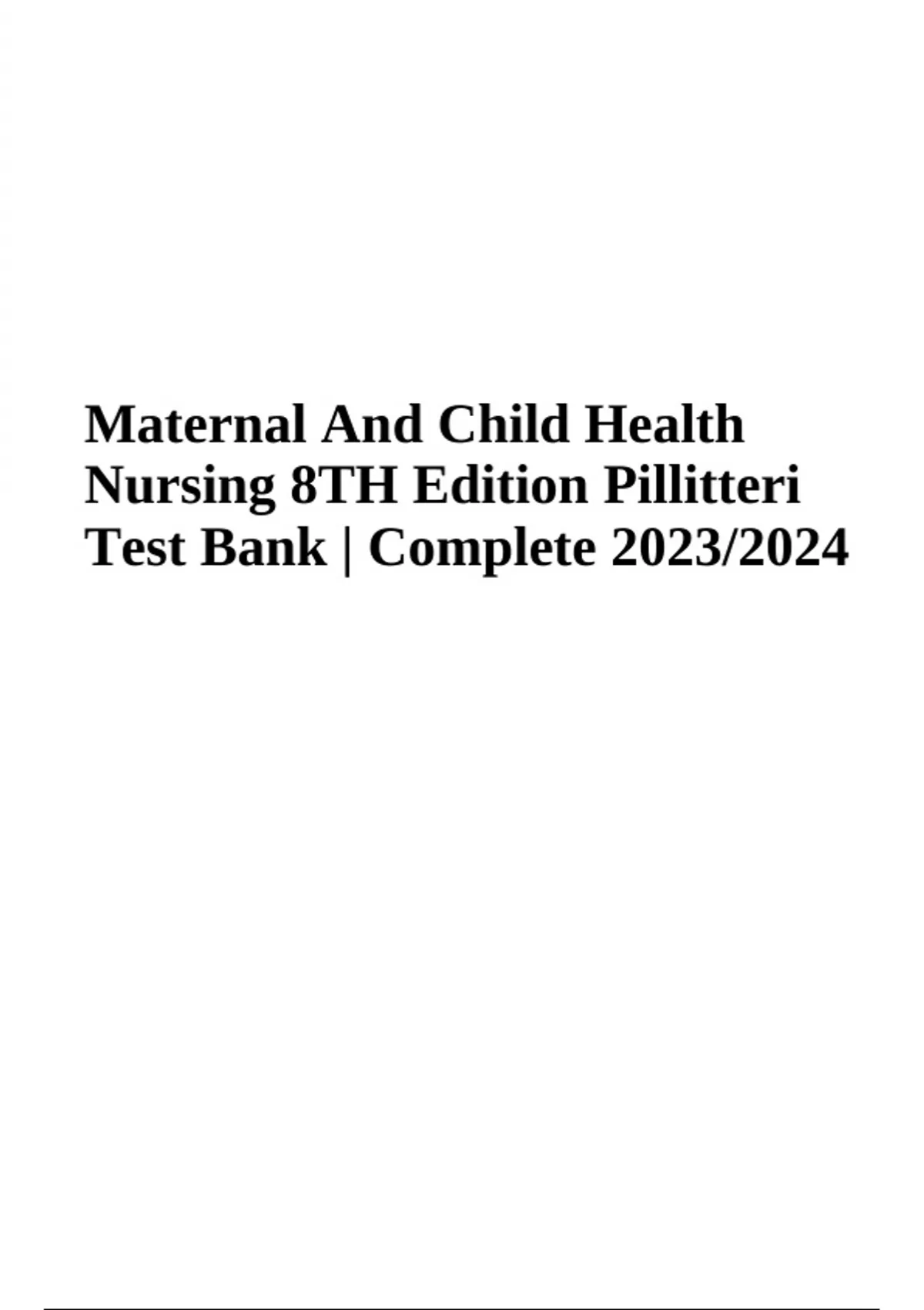 Maternal And Child Health Nursing 8TH Edition Pillitteri Test Bank | Complete 2023/2024