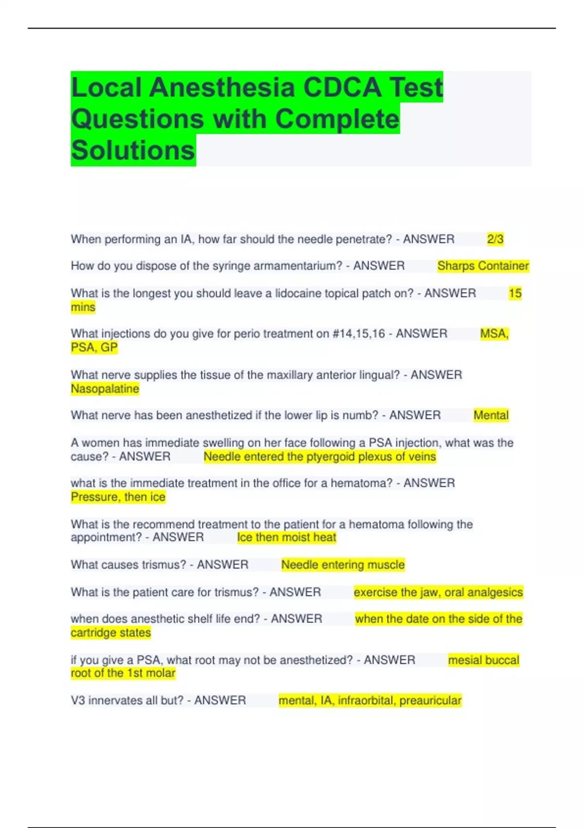 Local Anesthesia CDCA Test Questions with Complete Solutions When performing an IA, how far should the needle penetrate? - ANSWER 2/3 How do you dispose of the syringe armamentarium? - ANSWER Sharps Container What is the longest you should leave a lidocaine topical patch on? - ANSWER 15 mins What injections do you give for perio treatment on #14,15,16 - ANSWER MSA, PSA, GP What nerve supplies the tissue of the maxillary anterior lingual? - ANSWER Nasopalatine What nerve has been anesthetized if the lower lip is numb? - ANSWER Mental A women has immediate swelling on her face following a PSA injection, what was the cause? - ANSWER Needle entered the ptyergoid plexus of veins what is the immediate treatment in the office for a hematoma? - ANSWER Pressure, then ice What is the recommend treatment to the patient for a hematoma following the appointment? - ANSWER Ice then moist heat What causes trismus? - ANSWER Needle entering muscle What is the patient care for trismus? - ANSWER exercise the jaw, oral analgesics when does anesthetic shelf life end? - ANSWER when the date on the side of the cartridge states if you give a PSA, what root may not be anesthetized? - ANSWER mesial buccal root of the 1st molar V3 innervates all but? - ANSWER mental, IA, infraorbital, preauricular what would you not use for an intramural antiseptic on an injection site? - ANSWER Alcohol if you inject 1/3 of the needle on an IA and hit bone, what do you do? - ANSWER retract the needle from bone, readjust the syringe so the needle is pointing more posteriorly along the mandible
