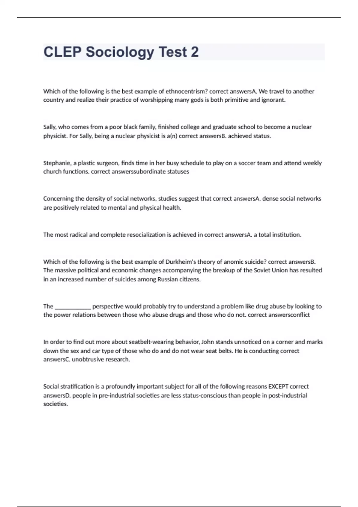 Which of the following is the best example of ethnocentrism? correct answersA. We travel to another country and realize their practice of worshipping many gods is both primitive and ignorant. Sally, who comes from a poor black family, finished college and graduate school to become a nuclear physicist. For Sally, being a nuclear physicist is a(n) correct answersB. achieved status. Stephanie, a plastic surgeon, finds time in her busy schedule to play on a soccer team and attend weekly church functions. correct answerssubordinate statuses Concerning the density of social networks, studies suggest that correct answersA. dense social networks are positively related to mental and physical health. The most radical and complete resocialization is achieved in correct answersA. a total institution. Which of the following is the best example of Durkheim's theory of anomic suicide? correct answersB. The massive political and economic changes accompanying the breakup of the Soviet Union has resulted in an increased number of suicides among Russian citizens.