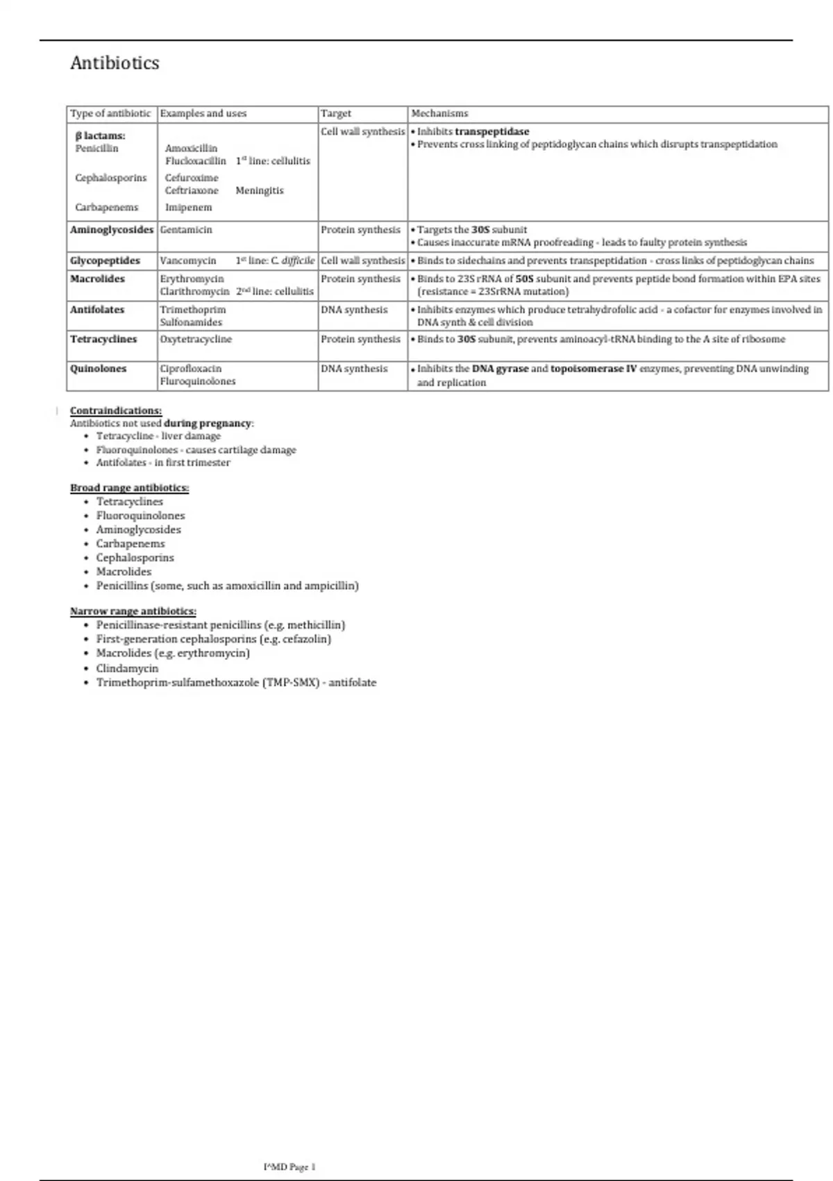 Concise summary on the different classes of antibiotics, the main examples of each, the drug target and mechanism of action. Also includes contraindications of certain types of antibiotics and examples of broad range and narrow range antibiotics