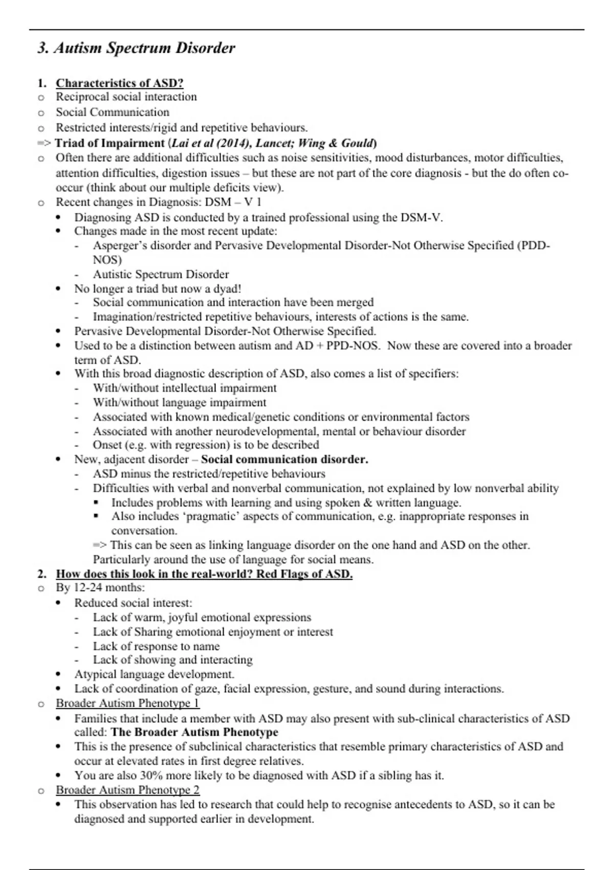 This is a well-rounded lecture summary of "Autism Spectrum Disorder” lecture in the Third Teaching Block in the Brain and Behaviour module, Year 1. The collection of notes form both the slides provided before the lecture and the actual lecture. It contains all the key points necessary in the exam. For all the first year psychology lectures in this block and in other blocks, including other modules, check out my profile.
