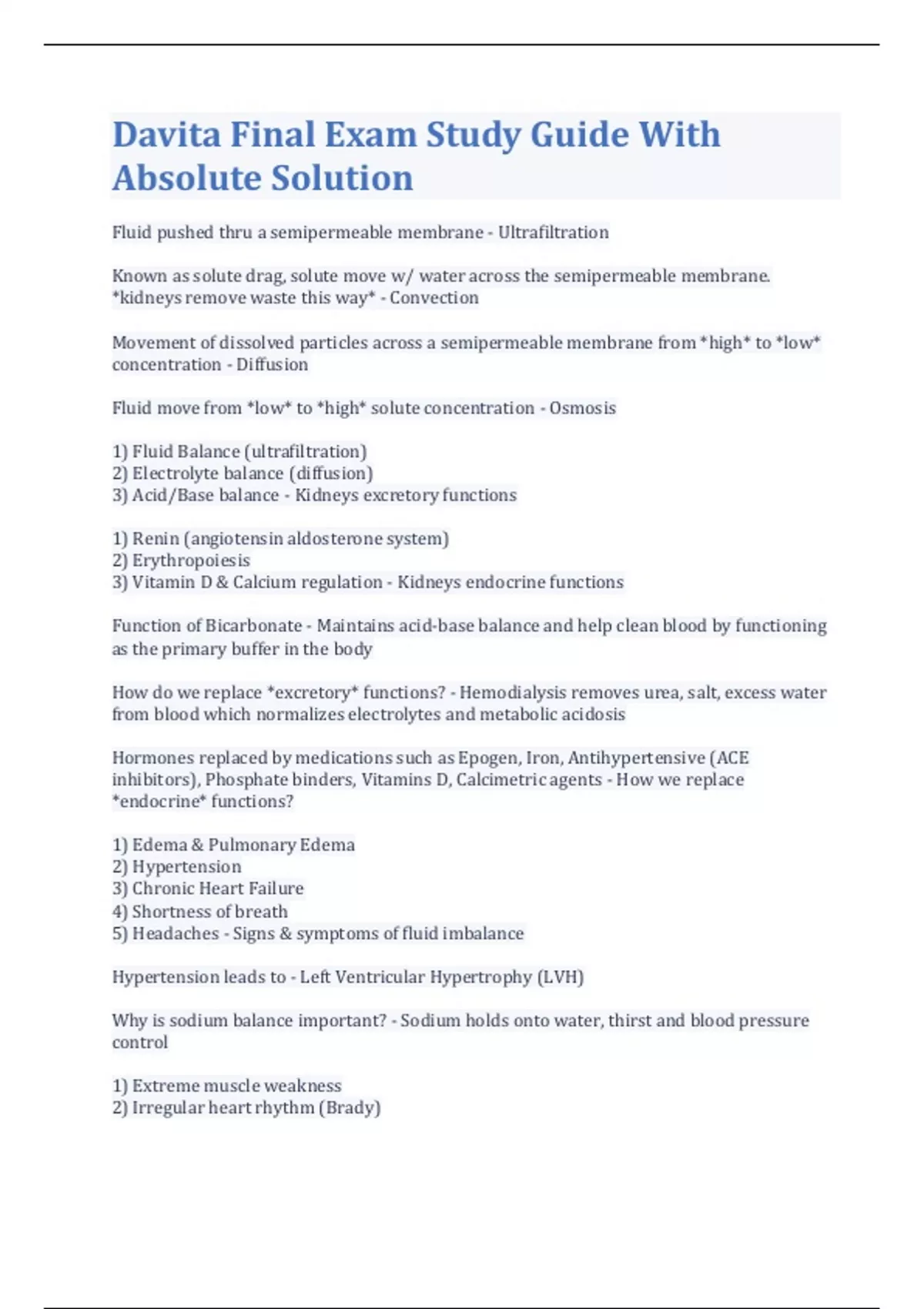 Davita Final Exam Study Guide With Absolute Solution Fluid pushed thru a semipermeable membrane - Ultrafiltration Known as solute drag, solute move w/ water across the semipermeable membrane. *kidneys remove waste this way* - Convection Movement of dissolved particles across a semipermeable membrane from *high* to *low* concentration - Diffusion Fluid move from *low* to *high* solute concentration - Osmosis 1) Fluid Balance (ultrafiltration) 2) Electrolyte balance (diffusion) 3) Acid/Base balance - Kidneys excretory functions 1) Renin (angiotensin aldosterone system) 2) Erythropoiesis 3) Vitamin D & Calcium regulation - Kidneys endocrine functions Function of Bicarbonate - Maintains acid-base balance and help clean blood by functioning as the primary buffer in the body How do we replace *excretory* functions? - Hemodialysis removes urea, salt, excess water from blood which normalizes electrolytes and metabolic acidosis Hormones replaced by medications such as Epogen, Iron, Antihypertensive (ACE inhibitors), Phosphate binders, Vitamins D, Calcimetric agents - How we replace *endocrine* functions? 1) Edema & Pulmonary Edema 2) Hypertension 3) Chronic Heart Failure 4) Shortness of breath 5) Headaches - Signs & symptoms of fluid imbalance Hypertension leads to - Left Ventricular Hypertrophy (LVH) Why is sodium balance important? - Sodium holds onto water, thirst and blood pressure control 1) Extreme muscle weakness 2) Irregular heart rhythm (Brady) 3) Wide QRS 4) Cardia arrest - Signs and symptoms of Hyperkalemia 1. Fatigue 2. Muscle weakness 3. Respiratory failure 4. Irritable heart muscle 4. Dysrhythmias (irregular heartbeat) 6. Cardia arrest - Signs and symptoms of Hypokalemia Lack of Erythropoeitin - Primary cause of anemia Secondary Cause of anemia? - blood loss 1) Heparin lines are clamped 2) Wait 3-5 min after Heparin dose 3) Proper priming - How to prevent blood loss What is the sac inflammation of the heart that is indicated by fever, hearing rub, low blood pressure, and chest pain? - Pericarditis 1) Lower heparin 2) More dialysis 3)* More antibiotics & anti-inflammatory meds* - Treatment of Pericarditis Recommend fatty lotions, lukewarm water, antihistamine (allergy relievers), pat not rub skin dry and checking phosphorus levels - If patient is complaining of dry, itchy skin What would you do if patient complaints of Peripheral Neuropathy (nerve pain)? - Check water temperature, wear good shoes, no barefeet, and observe/inspect feet 1) Calcium 2) Phosphorus 3) PTH (Parathyroid Hormone) 4) Calcium/Vitamin D - Four key elements affected in CKD-MBD What is AKI? - Acute Renal Injury (Failure), Kidneys can't filter waste from blood on their own. 1) Blood loss (Hemorrhaging) 2) Blood clots 3) Burns *Not getting blood flow to kidneys* - Examples of Pre- renal causes of AKI 1) Medications 2) Dyes * Not getting blood inside the kidneys* - Examples of Intra- renal causes of AKI 1. Kidney stones 2. Neurogenic bladder 3. Vesicoureteral reflux (reflux from bladder > ureter) *Blockage to kidneys* - Examples of Post-renal causes of AKI 1) Removing blockages 2) Managing blood loss 3) Dialysis till kidneys functions - How to help in restoring kidney function How do you protect kidneys from further injury? - Keeping a patient more "wet" than dry stimulates the kidneys to keep working and make urine. Be aware of dyes What is important when monitoring weight and BP? - Hypovolemia and hypotension episodes can cause renal/schiema and further damage to kidneys AKI patients are risk of ? - Kidney infections 1) Risk at infections 2) Access may not run well - Things to consider with vascular access (CVC) Difference between AKI & CKD - Acute: some urine production/kidney function ( Temporary Chronic: no urine & kidney function (permeant) 1) Immunocompromised because of kidney failure 2) Technicians going from patient to patient - Are what makes dialysis patients more susceptible to HAIs (Healthcare Associated Infections) 1) Prolonged access to patient's blood during hemodialysis 2) Bacterial infections especially w/ CVC's - Reasons why dialysis patients have an increase risk for acquiring a HAI at the facility What is the difference between OSHA and CMS infection control requirements? - OSHA (employers providing a safe workplace) CMS (patient care & safety) What are v-tags and why are they important - CMS/State regulations to be met to state guidelines important for infection control Which V-tags are relative for patient care and safety? - 110-148 1) Surgical masks 2) Sterile gloves/gown 3) Avoid touching exposed surfaces - Three strategies recommended by KDOQI to decrease risk of infection when working w/ CVC's Hepatitis B surface Antigen (HBsAg) are performed...? - Monthly Anti-HBs - Hepatitis B surface antibody Anti-HBclgm - Hepatitis B Core antibody The manual conductive value must match +/-______ on the Fresenius (FMC) dialysis delivery system displayed conductivity. - 0.4 What is the safe dialysate pH range? - 6.9 to 7.6 What is "strikethrough" of an external pressure transducer? - blood contamination Why is strikethrough important? - Fluid could have enter the machine and contaminated the internal pressure and transducer protector provider a revivor for microorganisms which can lead to blood infections Why is it important for patient care teammates to know when the water treatment system disinfection was performed? - It will introduce disinfectant solution in the dialysis delivery systems thru water inlet lines 1) Following standard care makes the care given defensible and avoids negligence's part of the ... - Reasonable & Prudent Standard Care for Nephrology Nursing Key Concept When supervising non -licensed techs it is the responsibility of the ______ _______ to ensure these teammates also meet standard of care - licensed nurse 1) Davita provides standard of care 2) Acting accordingly to Davita ____ & _____ is "prima facie" (first sight) evidence to compliance 3) Davita _____ & ______ serves "best d