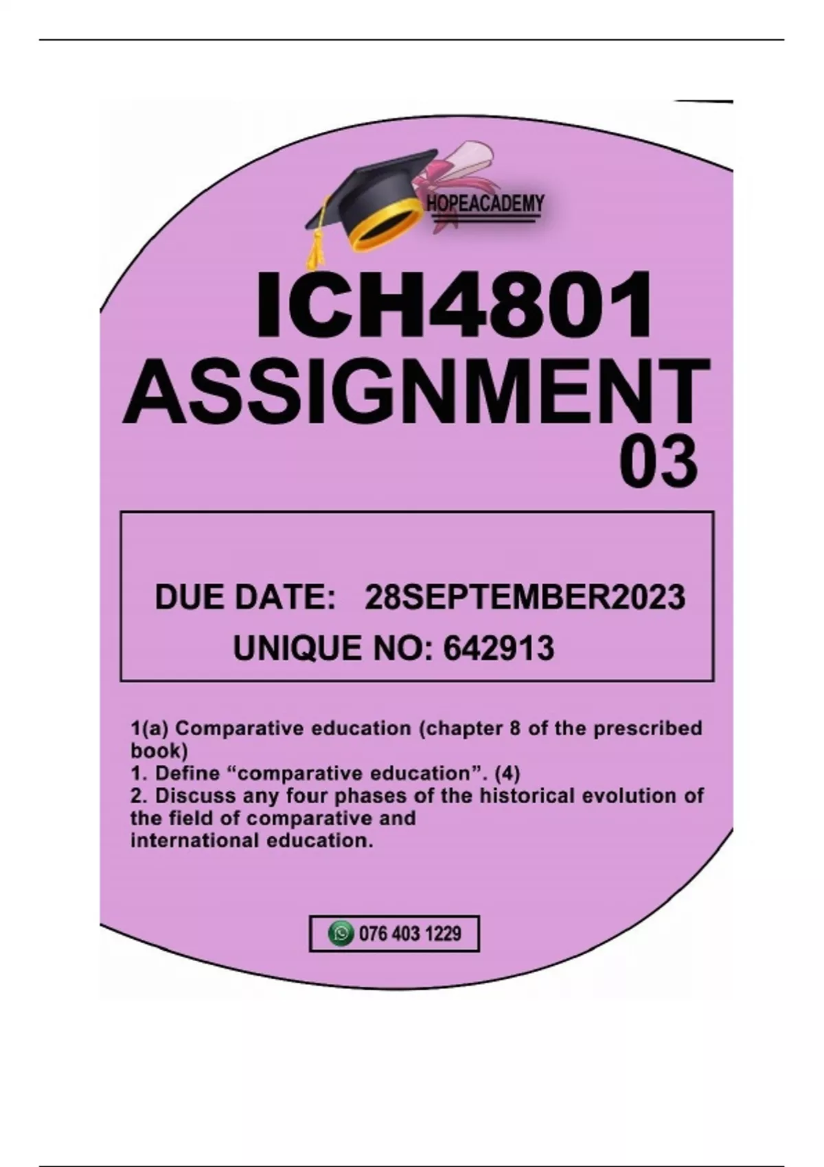 , ICH4801 ASSIGNMENT03 DUE 28 SEPTEMBER