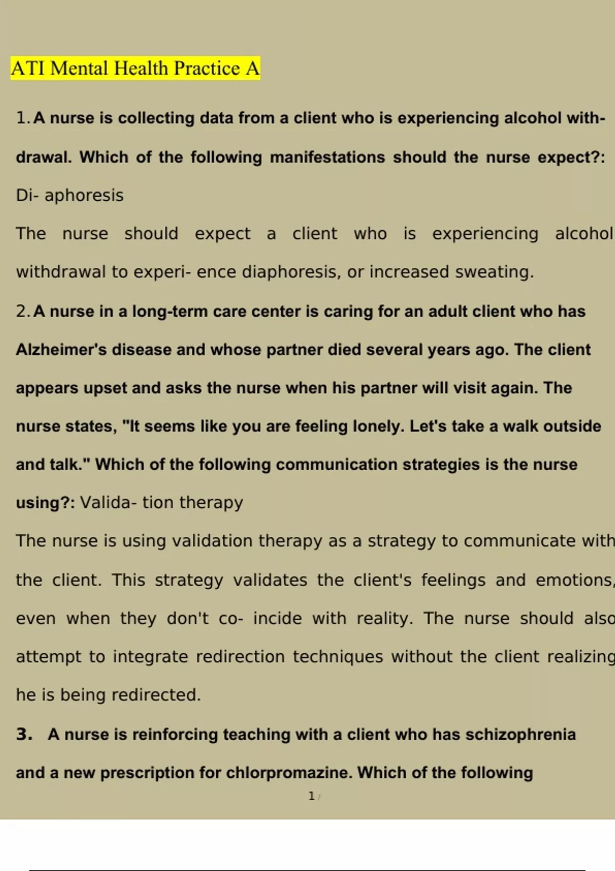 1. A nurse is collecting data from a client who is experiencing alcohol with-