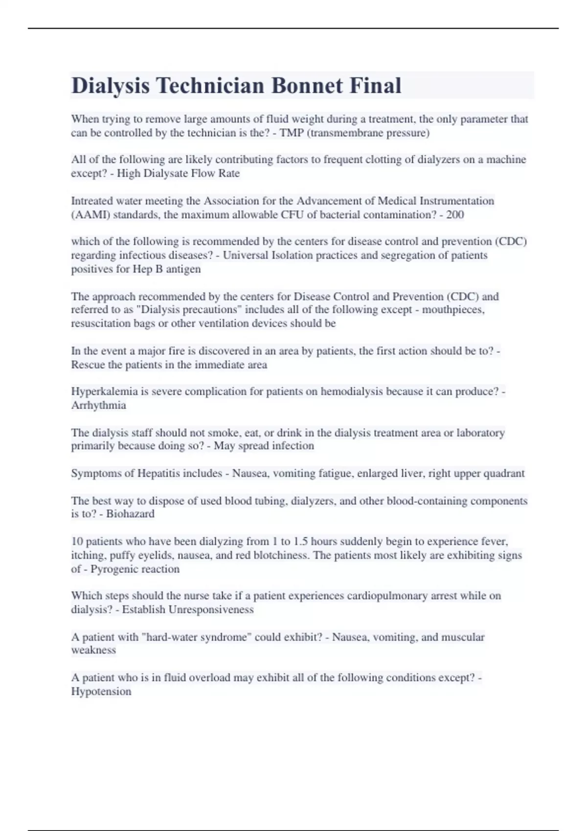 Dialysis Technician Bonnet Final When trying to remove large amounts of fluid weight during a treatment, the only parameter that can be controlled by the technician is the? - TMP (transmembrane pressure) All of the following are likely contributing factors to frequent clotting of dialyzers on a machine except? - High Dialysate Flow Rate Intreated water meeting the Association for the Advancement of Medical Instrumentation (AAMI) standards, the maximum allowable CFU of bacterial contamination? - 200 which of the following is recommended by the centers for disease control and prevention (CDC) regarding infectious diseases? - Universal Isolation practices and segregation of patients positives for Hep B antigen The approach recommended by the centers for Disease Control and Prevention (CDC) and referred to as "Dialysis precautions" includes all of the following except - mouthpieces, resuscitation bags or other ventilation devices should be In the event a major fire is discovered in an area by patients, the first action should be to? - Rescue the patients in the immediate area Hyperkalemia is severe complication for patients on hemodialysis because it can produce? - Arrhythmia The dialysis staff should not smoke, eat, or drink in the dialysis treatment area or laboratory primarily because doing so? - May spread infection Symptoms of Hepatitis includes - Nausea, vomiting fatigue, enlarged liver, right upper quadrant The best way to dispose of used blood tubing, dialyzers, and other blood-containing components is to? - Biohazard 10 patients who have been dialyzing from 1 to 1.5 hours suddenly begin to experience fever, itching, puffy eyelids, nausea, and red blotchiness. The patients most likely are exhibiting signs of - Pyrogenic reaction Which steps should the nurse take if a patient experiences cardiopulmonary arrest while on dialysis? - Establish Unresponsiveness A patient with "hard-water syndrome" could exhibit? - Nausea, vomiting, and muscular weakness