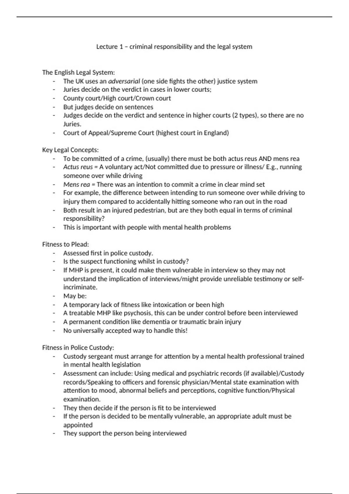 Lecture 1 – criminal responsibility and the legal system