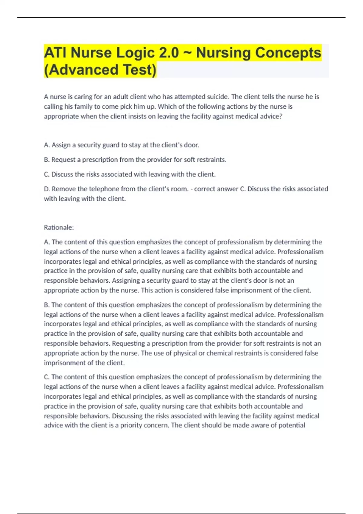 A nurse is caring for an adult client who has attempted suicide. The client tells the nurse he is calling his family to come pick him up. Which of the following actions by the nurse is appropriate when the client insists on leaving the facility against medical advice? A. Assign a security guard to stay at the client's door. B. Request a prescription from the provider for soft restraints. C. Discuss the risks associated with leaving with the client. D. Remove the telephone from the client's room. C. Discuss the risks associated with leaving with the client. Rationale: A. The content of this question emphasizes the concept of professionalism by determining the legal actions of the nurse when a client leaves a facility against medical advice. Professionalism incorporates legal and ethical principles, as well as compliance with the standards of nursing practice in the provision of safe, quality nursing care that exhibits both accountable and responsible behaviors. Assigning a security guard to stay at the client's door is not an appropriate action by the nurse. This action is considered false imprisonment of the client. B. The content of this question emphasizes the concept of professionalism by determining the legal actions of the nurse when a client leaves a facility against medical advice. Professionalism incorporates legal and ethical principles, as well as compliance with the standards of nursing practice in the provision of safe, quality nursing care that exhibits both accountable and responsible behaviors. Requesting a prescription from the provider for soft restraints is not an appropriate action by the nurse. The use of physical or chemical restraints is considered false imprisonment of the client. C. The content of this question emphasizes the concept of professionalism by determining the legal actions of the nurse when a client leaves a facility against medical advice. Professionalism incorporates legal and ethical principles, as well as compliance with the standards of nursing practice in the provision of safe, quality nursing care that exhibits both accountable and responsible behaviors. Discussing the risks associated with leaving the facility against medical advice with the client is a priority concern. The client should be made aware of potential negative outcomes that could occur if he chooses to leave the facility prior to physician-prescribed discharge. D. The content of this question emphasizes the concept of professionalism by determining the legal actions of the nurse when a client leaves a facility against medical advice. Professionalism incorporates legal and ethical principles, as well as compliance with the standards of nursing practice in the provision of safe, quality nursing care that exhibits both accountable and responsible behaviors. Removing the telephone from the client's room is not an appropriate action by the nurse. This action is considered false imprisonment of the client. A nurse is caring for a client who is receiving parenteral nutrition through a nontunneled central venous catheter and reports hearing a gurgling sound on the side of the catheter. The nurse suspects the catheter has migrated to the jugular vein. Which of the following actions should the nurse take first? A. Notify the provider. B. Obtain a chest x-ray. C. Flush the catheter. D. Stop the infusion. D. Stop the infusion. Rationale: A. The content of this question emphasizes the concept of priority setting by determining the first action the nurse should take when suspecting a central venous catheter has migrated to the jugular vein. Priority setting is the use of nursing judgment when making decisions about the rank order in which to take nursing actions. Various priority setting frameworks, such as Maslow's Hierarchy of Needs, nursing process, ABC, and safety and risk reduction, can be useful in determining the priority of needed actions. Notifying the provider is important; however, this action should be taken after flushing the catheter when suspecting a central venous catheter has migrated to the jugular vein. There is another option that better ensures client safety. B. The content of this question emphasizes the concept of priority setting by determining the first action the nurse should take when suspecting a central venous catheter has migrated to the jugular vein. Priority setting is the use of nursing judgment when making decisions about the rank order in which to take nursing actions. Various priority setting frameworks, such as Maslow's Hierarchy of Needs, nursing process, ABC, and safety and risk reduction, can be useful in determining the priority of needed actions. Obtaining a chest x-ray is important; however, this action should be taken after notifying the provider when suspecting the central venous catheter has migrated to the jugular vein. There is another option that better ensures client safety. C. The content of this question emphasizes the concept of priority setting by determining the first action the nurse should take when suspecting a central venous catheter has migrated to the jugular vein. Priority setting is the use of nursing judgment when making decisions about the rank order in which to take nursing actions. Various priority setting frameworks, such as Maslow's Hierarchy of Needs, nursing process, ABC, and safety and risk reduction, can be useful in determining the priority of needed actions. Flushing the catheter is important; however, this action should be taken after stopping the infusion when suspecting a central venous catheter has migrated to the jugular vein. There is another option that better ensures client safety. D. The content of this question emphasizes the concept of priority setting by determining the first action the nurse should take when suspecting a central venous catheter has migrated to the jugular vein. Priority setting is the use of nursing judgment when making decisions about the rank order in which to take nursing actions. Various