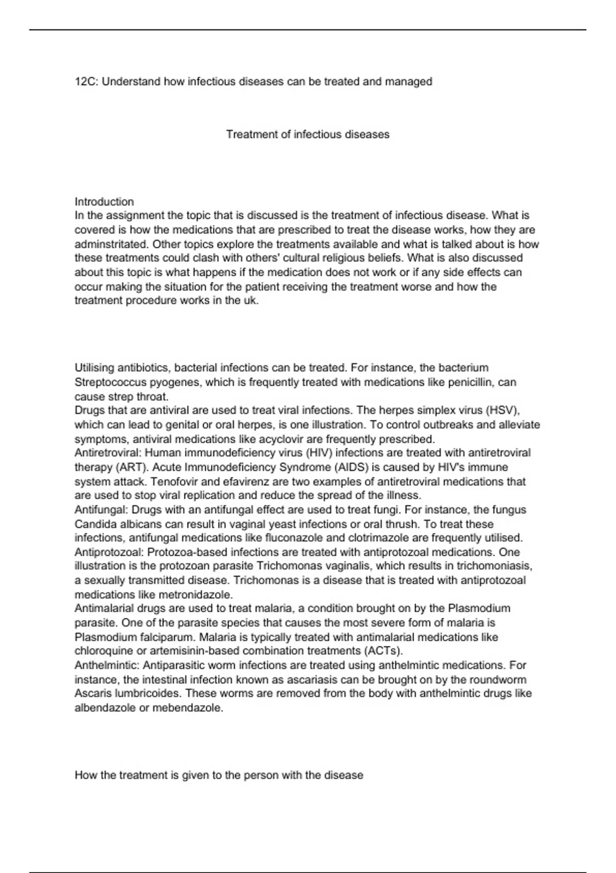 In the assignment the topic that is discussed is the treatment of infectious disease. What is