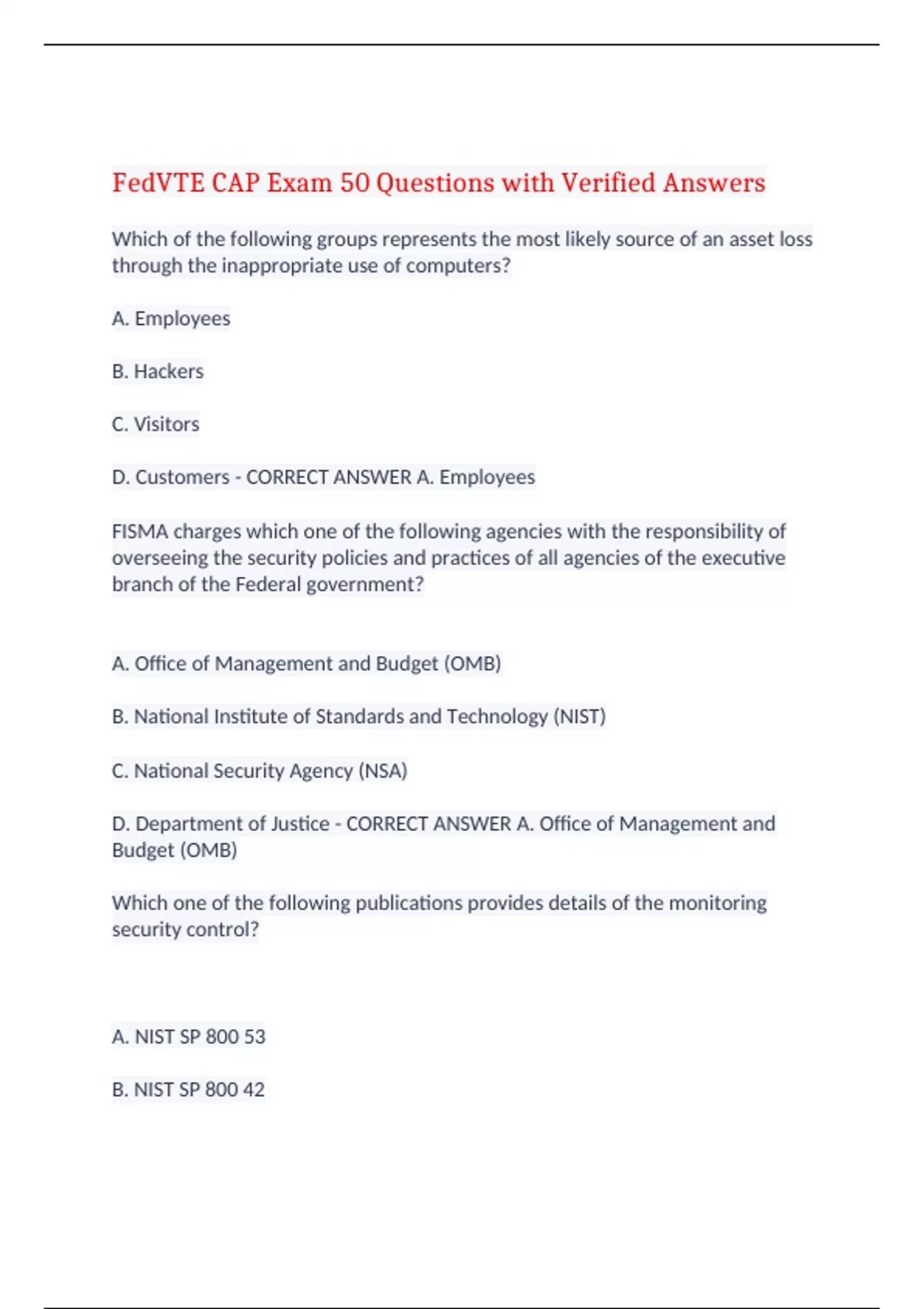 FedVTE CAP Exam 50 Questions with Verified Answers Which of the following groups represents the most likely source of an asset loss through the inappropriate use of computers? A. Employees B. Hackers C. Visitors D. Customers - CORRECT ANSWER A. Employees FISMA charges which one of the following agencies with the responsibility of overseeing the security policies and practices of all agencies of the executive branch of the Federal government? A. Office of Management and Budget (OMB) B. National Institute of Standards and Technology (NIST) C. National Security Agency (NSA) D. Department of Justice - CORRECT ANSWER A. Office of Management and Budget (OMB) Which one of the following publications provides details of the monitoring security control? A. NIST SP 800 53 B. NIST SP 800 42 C. NIST SP 800 37 D. NIST SP 800 41 - CORRECT ANSWER C. NIST SP 800 37 Which of the following statements about Discretionary Access Control List (DACL) is true? A. It is a list containing user accounts, groups, and computers that are allowed (or denied) access to the object. B. It specifies whether an audit activity should be performed when an object attempts to access a resource. C. It is a unique number that identifies a user, group, and computer account. D. It is a rule list containing access control entries. - CORRECT ANSWER A. It is a list containing user accounts, groups, and computers that are allowed (or denied) access to the object. FIPS Publication 199 defines three levels of potential impact to the compromise of confidentiality, integrity, and availability. These levels are: A. Minimum, Normal, Maximum B. Low, Moderate, High C. Unclassified, Confidential, Secret D. Confidential, Secret, Top Secret - CORRECT ANSWER B. Low, Moderate, High Which of the following individuals is responsible for monitoring the information system environment that can negatively impact the security of the system and its accreditation? A. Chief Information Security Officer B. Chief Information Officer C. Chief Risk Officer D. Information System Owner - CORRECT ANSWER D. Information System Owner Which of the following professionals plays the role of a monitor and takes part in the organizations configuration management process? A. Senior Agency Information Security Officer B. Authorizing Official C. Common Control Provider D. Chief Information Officer - CORRECT ANSWER C. Common Control Provider Which of the following is not a standard phase in the System Authorization Process? A. Pre certification B. Post authorization C. Post certification D. Certification - CORRECT ANSWER C. Post certification What is the potential impact if the loss of confidentiality, integrity, or availability could be expected to have a limited adverse effect on organizational operations, organizational assets, individuals, other organizations, or the national security interests of the United States? A. Low B. Moderate C. High D. Limited - CORRECT ANSWER A. Low An assessment procedure consists of a set of which things, each with an associated set of potential assessment methods and assessment objects? A. Assessment objectives B. Security controls C. Operational requirements D. Assessment objects - CORRECT ANSWER A. Assessment objectives This process is used to determine if the security controls in the information system continue to be effective over time in light of the inevitable changes that occur in the system as well as the environment in which the system operates between authorization decisions. A. Continuous monitoring B. Configuration management C. Vulnerability assessment D. Certification and accreditation - CORRECT ANSWER A. Continuous monitoring Who does an organization require that is capable of conducting an impartial assessment of security controls employed within or inherited by an information system? A. Vendor assessor B. Technical expert C. Authorization assessor D. Independent assessor - CORRECT ANSWER D. Independent assessor Which of the following NIST documents provides a guideline for identifying an information system as a National Security System? A. NIST SP 800 59 B. NIST SP 800 53 C. NIST SP 800 60 D. NIST SP 800 37 - CORRECT ANSWER A. NIST SP 800 59 Subsequent to a security breach, which of the following techniques are used with the intention to limit the extent of damage caused by the incident? A. Corrective controls B. Preventive controls C. Change controls D. Incident controls - CORRECT ANSWER A. Corrective controls What process should be initiated when changes to the information system negatively impact the security of the system or when a period of time has elapsed as specified by agency or federal policy? A. IS audit B. Systems acquisition C. Reauthorization D. Reclassification of data - CORRECT ANSWER C. Reauthorization Which of the following documents can be best aid in selecting controls to be monitored? A. NIST SP 800 37 B. FISMA C. FIPS 199 D. NIST SP 800 18 - CORRECT ANSWER C. FIPS 199 Applying the first three steps in the RMF to legacy systems can be viewed in what way to determine if the necessary and sufficient security controls have been appropriately selected and allocated? A. Sequential B. Level of effort C. Gap analysis D. Common control - CORRECT ANSWER C. Gap analysis In which type of access control do user ID and password system come under? A. Physical B. Administrative C. Power D. Technical - CORRECT ANSWER D. Technical Which role in the security authorization process is responsible for organizational information systems? A. IS program manager B. Designated authorizing official C. Certification agent D. User representative - CORRECT ANSWER B. Designated authorizing official What assessment procedure is designed to work with and complement the assessment procedures to contribute to the grounds for confidence in the effectiveness of the security controls employed in the information system? A. Extended B. Subordinate C. Based D. Cross control - CORRECT ANSWER A. Extended Why would the authorization decision issue