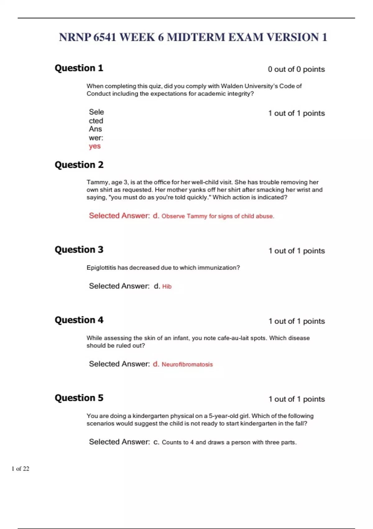 Question 1 0 out of 0 points When completing this quiz, did you comply with Walden University’s Code of Conduct including the expectations for academic integrity? Selected Answer: yes Question 2 1 out of 1 points Tammy, age 3, is at the office for her well-child visit. She has trouble removing her own shirt as requested. Her mother yanks off her shirt after smacking her wrist and saying, "you must do as you're told quickly." Which action is indicated? Selected Answer: d. Observe Tammy for signs of child abuse. Question 3 Epiglottitis has decreased due to which immunization? Selected Answer: d. Hib Question 4 1 out of 1 points 1 out of 1 points While assessing the skin of an infant, you note cafe-au-lait spots. Which disease should be ruled out? Selected Answer: d. Neurofibromatosis Question 5 1 out of 1 points You are doing a kindergarten physical on a 5-year-old girl. Which of the following scenarios would suggest the child is not ready to start kindergarten in the fall? Selected Answer: c. Counts to 4 and draws a person with three parts. Question 6 1 out of 1 points Mark is in the exam room. You are concerned he may have epiglottitis. In what position do these patients prefer to sit? Selected Answer: a. Sitting up and leaning forward Question 7 A typically developing 8-year-old girl will have which of the following genital development? Selected Answer: b. Small amount of long, downy pubic hair along the labia majora Question 8 An expected milestone of a 4-year-old is the ability to Selected Answer: b. Copy a cross Question 9 1 out of 1 points 1 out of 1 points Appropriate advice for a mother of a 2-week-old child here for a “well child” visit includes which of the following? Selected Answer: d. Sleep in the supine position is recommended Question 10 A common feature of 2-year-old behavior is: Selected Answer: c. Nonparallel play Question 11 The first sign of the onset of female puberty is usually: Selected Answer: a. Breast buds Question 12 0 out of 1 points 1 out of 1 points 1 out of 1 points