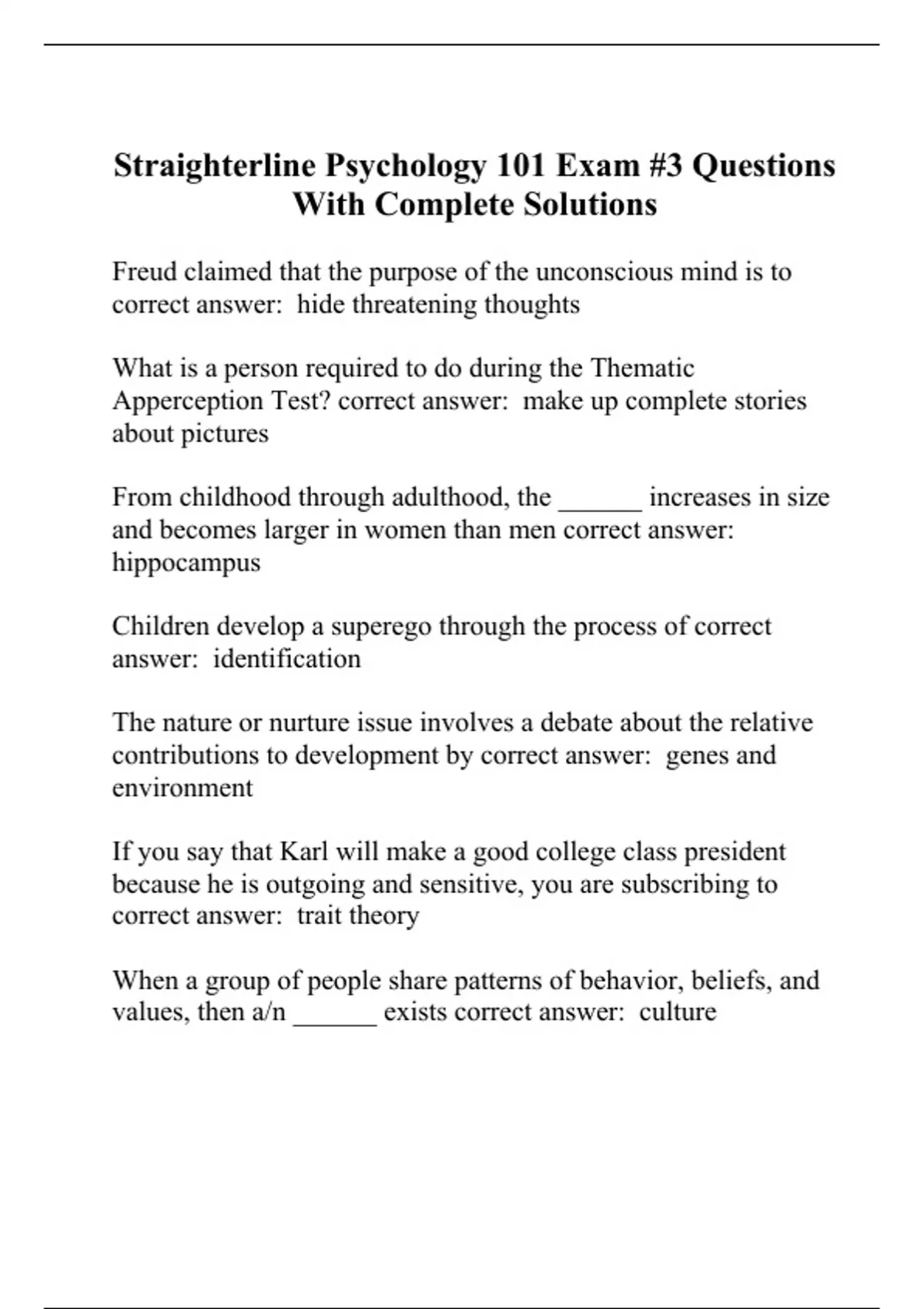 Straighterline Psychology 101 Exam #3 Questions With Complete Solutions