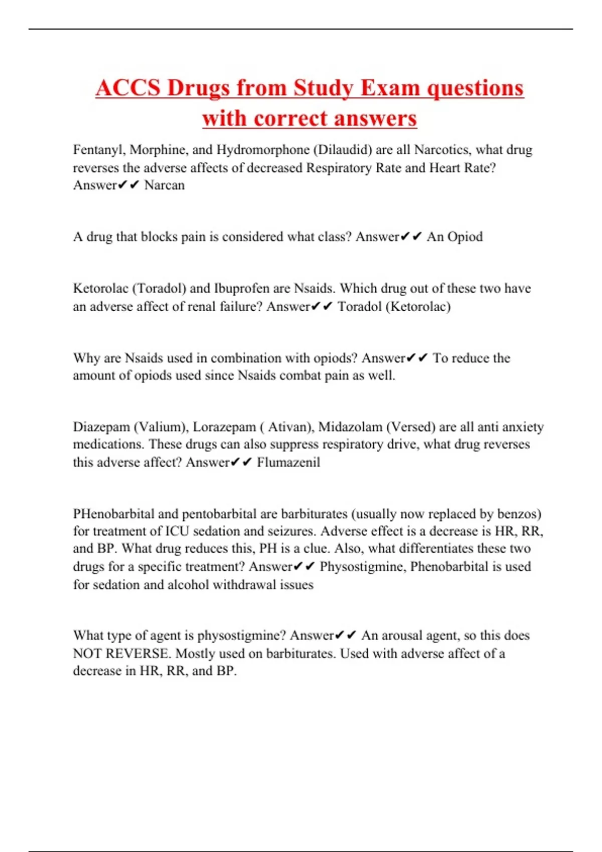 Fentanyl, Morphine, and Hydromorphone (Dilaudid) are all Narcotics, what drug reverses the adverse affects of decreased Respiratory Rate and Heart Rate? Answer Narcan A drug that blocks pain is considered what class? Answer An Opiod Ketorolac (Toradol) and Ibuprofen are Nsaids. Which drug out of these two have an adverse affect of renal failure? Answer Toradol (Ketorolac) Why are Nsaids used in combination with opiods? Answer To reduce the amount of opiods used since Nsaids combat pain as well. Diazepam (Valium), Lorazepam ( Ativan), Midazolam (Versed) are all anti anxiety medications. These drugs can also suppress respiratory drive, what drug reverses this adverse affect? Answer Flumazenil PHenobarbital and pentobarbital are barbiturates (usually now replaced by benzos) for treatment of ICU sedation and seizures. Adverse effect is a decrease is HR, RR, and BP. What drug reduces this, PH is a clue. Also, what differentiates these two drugs for a specific treatment? Answer Physostigmine, Phenobarbital is used for sedation and alcohol withdrawal issues What type of agent is physostigmine? Answer An arousal agent, so this does NOT REVERSE. Mostly used on barbiturates. Used with adverse affect of a decrease in HR, RR, and BP.