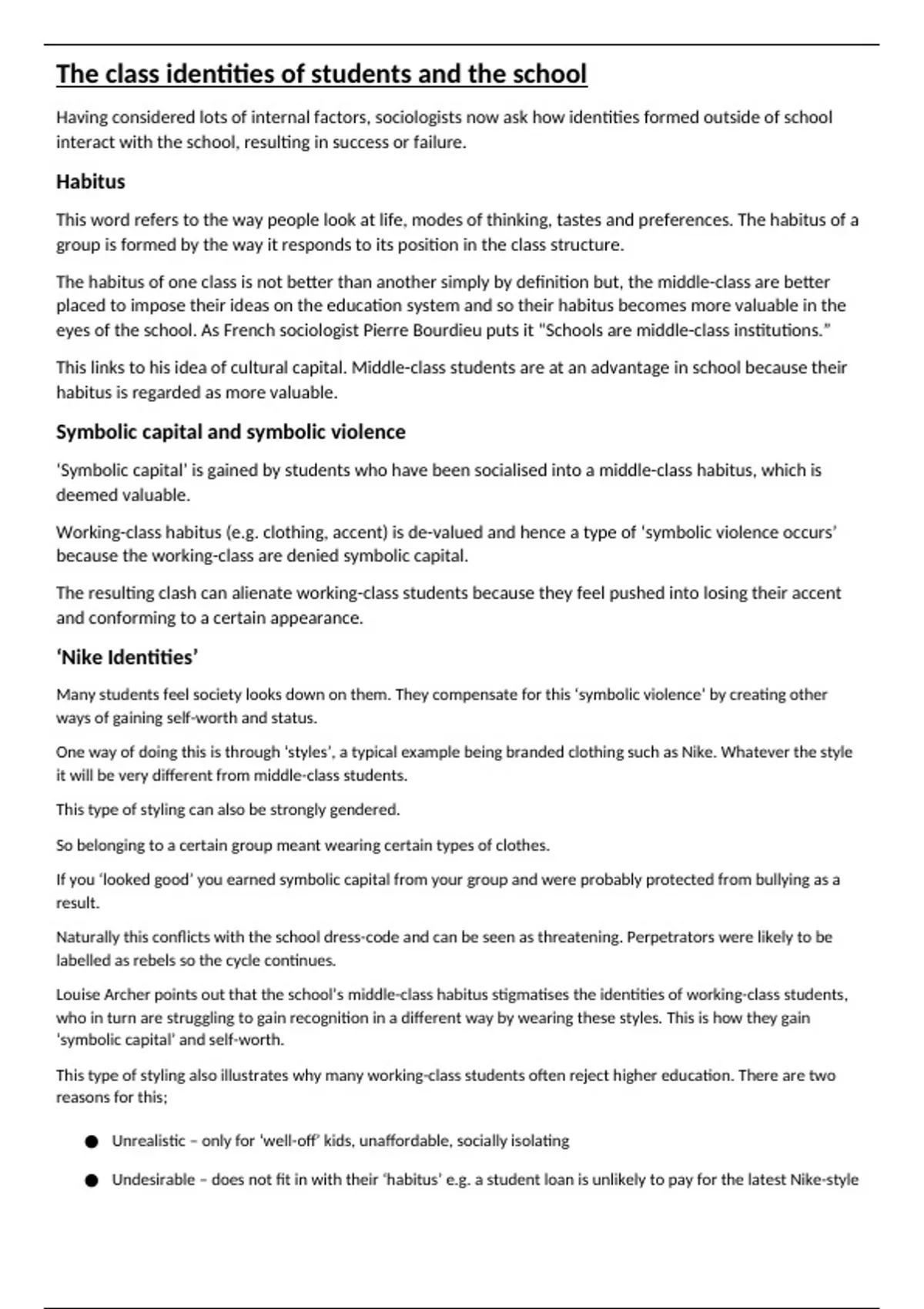 Summary Sociology - The class identities of students and the school