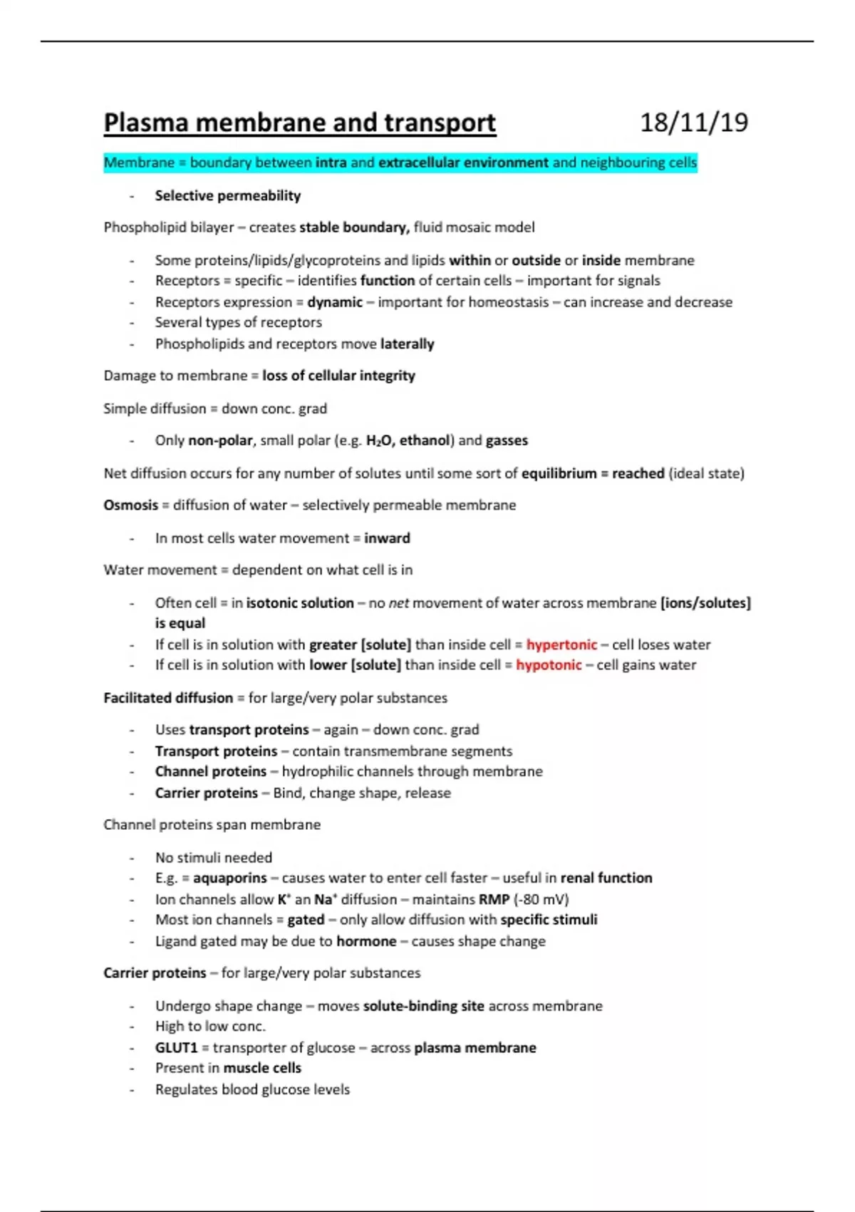Membrane = boundary between intra and extracellular environment and neighbouring cells